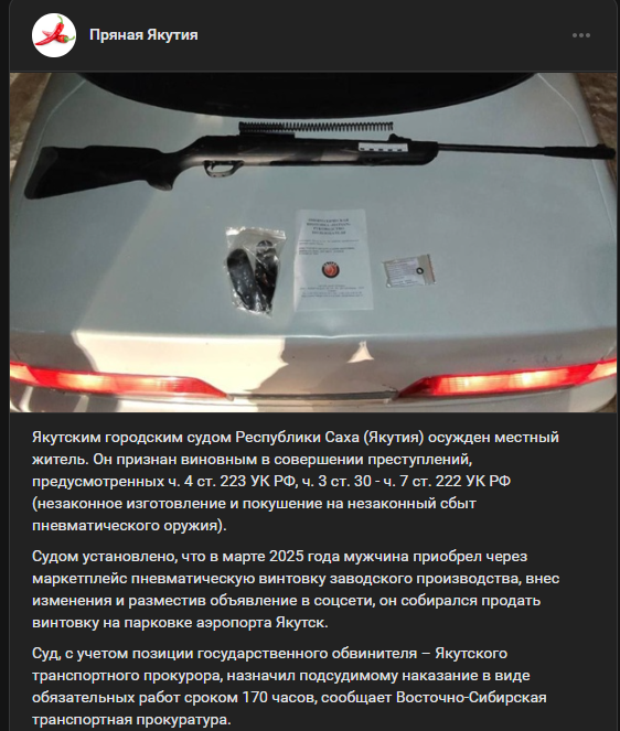 Не могу найти фото с экспертизы, в одном чате скидывали, приняли типа с хатсаном, не успел аб дёрнуть, установили что было что то около 60 дж, типу условку дали, за переделку, об изготовлении речи не шло.