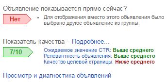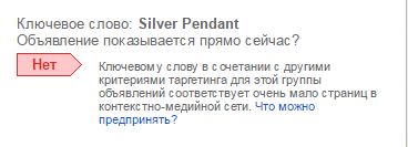 Так получаю вот что: Объявление показывается прямо сейчас? Нет Показ рекламы в Google по вашему ключевому слову сейчас не производится из-за низкого рейтинга объявлений (зависит от размера ставок и показателя качества). Что можно предпринять? Это объявление не показывается из-за настроек таргетинга на платформу. Что можно предпринять?