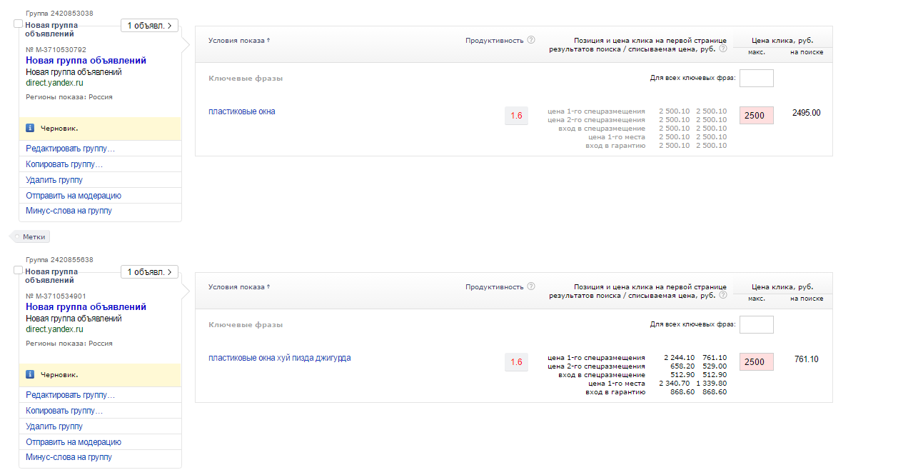 >>100442 >1 объявление - 1 ключ На кой? Это мантра для нубов. Смело группируй ключевики в группы и пиши под них 1 объявление. Потом посмотри, какие ключи самые ок - скопируй их в новую группу с фразовым соответствием. А уж из этой новой группы самые рентабельные ключи вытаскивай в отдельные группы.