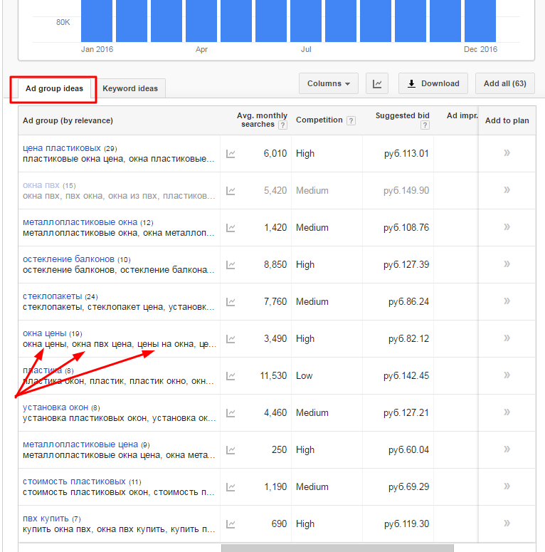 >>101893 >>101894 Пик1: кликаем на вкладку Ad Group Пик2: гугль группирует все ключи в группы, в которых есть 2 слова из твоего запроса. Выбираем любую. Пик3: Минусуем ненужное, добавляем в план нужное для этой группы (с хвостом).