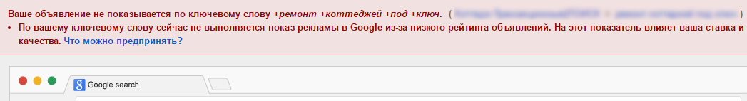 Если да, как я понимаю, у меня где-то косяк с типами соответствия и минусовкой (последнюю вообще не делал, некоторые ключи бывают одинаковые в одной группе, но с разными типами соответствия). При этом: по ключам есть статистика показов/кликов, есть лиды, все ок. НО: на всех ключах во всех группах гугл пишет упомянутую выше фразу (кроме одного ключа, там пишет про низкий рейтинг) и утверждает, что показа НЕТ.