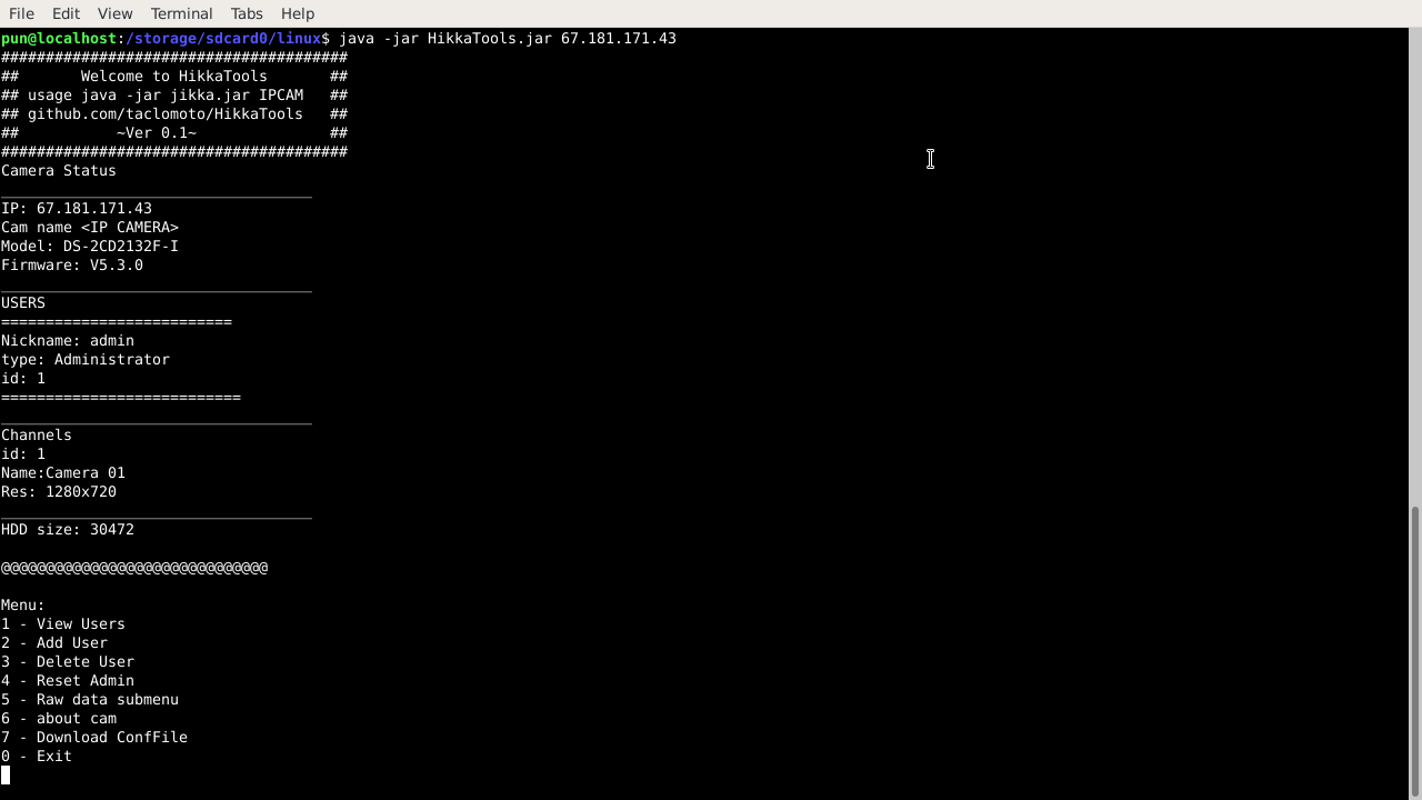 -bf-threads int Bruteforcer threads count (default 1) -check Check cameras (experimental and not fully tested, but very useful) -csv string Write result to CSV -json string Write result to JSON -logins string A file with a list of logins to bruteforce (default "logins") -m3u string Write result to m3u playlist -passwords string A file with a list of passwords to bruteforce (default "passwords") -port int Camera service port (default 8000) -shoots string Download pics from cameras into a folder -threads int Threads count (default 1)