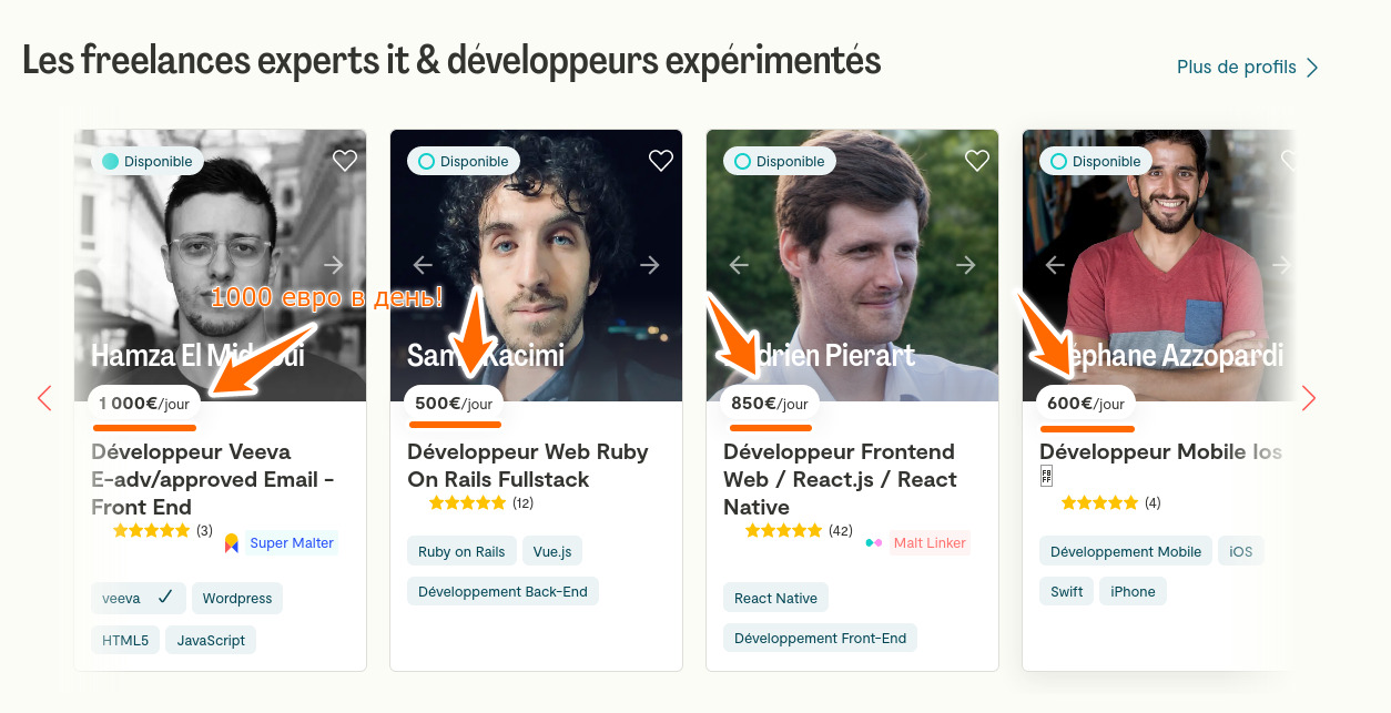 >>132494 ...продолжаю палить тему забугорного фриланса. Вот смотри, сайт https://www.malt.fr/ сколько люди получают. У всех рейты 450-1000 евро в день. Считай от 50к рублей в день. А ты продолжай дальше твердить, что нужно знать английский.