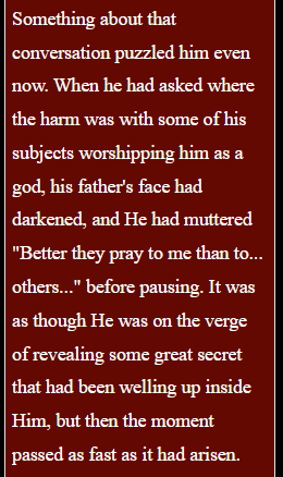The prophet was a man like no other; taller than any of the Tabor, he wore armour of jet and gold, his great gauntlet could shatter any barred gate and his blade could cut even Qaseen steel. No man could meet his burning gaze and the hetmen of the clans learned from him of the true nature of the Gods and how to bring death to our enemies.