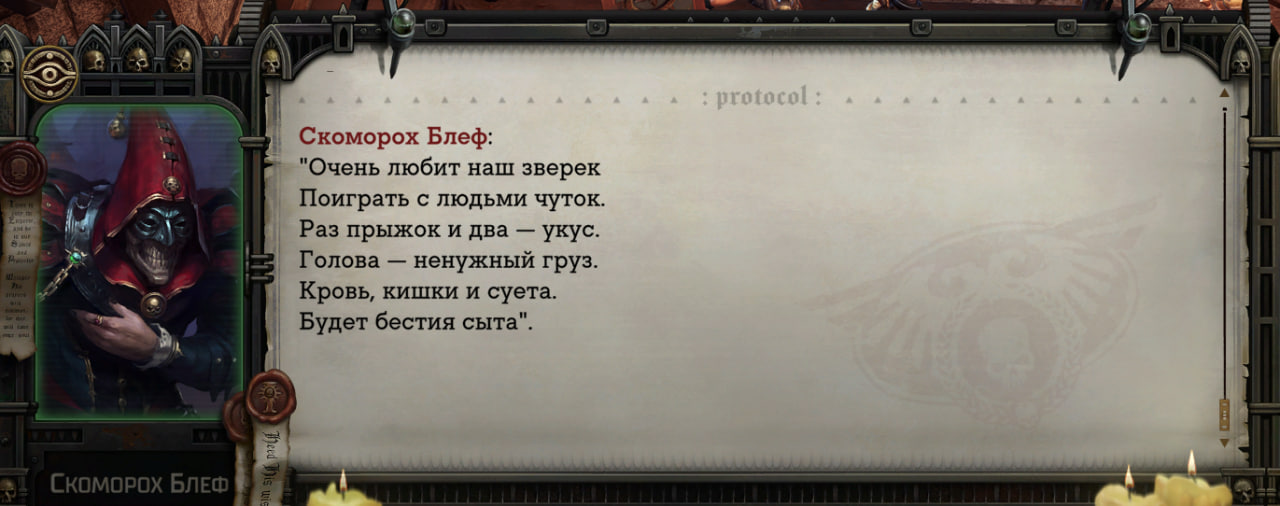 Блэд, напомнил. Я в первое прохождение проебал тему с курсами некронского языка, ну и нормально завершил игру под их древнеебипетское чириканье, норм же, ДРЕВНИЕ МАШИНЫ ВОССТАЛИ ИЗ ГРОБНИЦ, тоси-боси, непонятно, непозноваемо, страшно (чуть-чуть). А во второй проход все-таки обучился их грамоте, и ради чего? А чтобы слушать их кринжовые визги "убить всех человеков", "нечестивцы на территории, АКТИВИРОВАТЬ ПРОТОКОЛ РАЗДАЧИ ПИЗДЮЛЕЙ" и перекинуться парой слов с умирающим толстомясом, который последний минибосс перед встречей с лорд-инквизитором, узнать, что он, видите ли, ненавидит все живое, но зело ценит воинскую доблесть. Причем там кто-то из моей свиты (по-моему, Волчара и Кибблз) еще заводят шарманку: "о бляяя, какой могучий воитель пал, сразу видно, мировой был мужик, помянем", лол.
