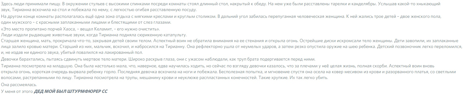 >>12007 >сочинивший пасту про Ангрона и еще что-то в том же роде. >А был довольно поехавший криговец, тоже графоман. Это был один и тот же человек. Каждый день его в зеркале вижу. А криговские пасты были запилены ради трали-вали, строго по реквесту "вывалять Криг в сахаре". Ну,кроме Лилеатоны, которой по-настоящему снится криговец.[/spoiler Ну хоть про Ишу получилось - и то хорошо > еще что-то в том же роде. Ничего в том же роде! Всё было очень мило. Про приёмную эльдарскую маму Ангрона и Лотару- его приёмную дочь. Про Пожирателя Эльдар- такое было один раз. А не,второй.Первый был про эльдарку-некромантку,поднимающую из могилы убитого криговца.
