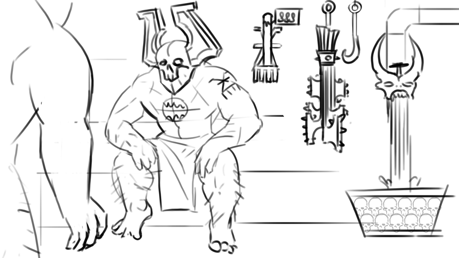 Есть идейка. Несколько маринов сидят, пьют чаек, болтают о высоком, на заднем фоне беснуется Хренд и орет, что его уж точно тут нет. Собственно, нужны сами марины - кого рисовать, и реф этого ебучего дредноута НЕ с обложки книжки про Талларн. Чтобы стоял прямо.
