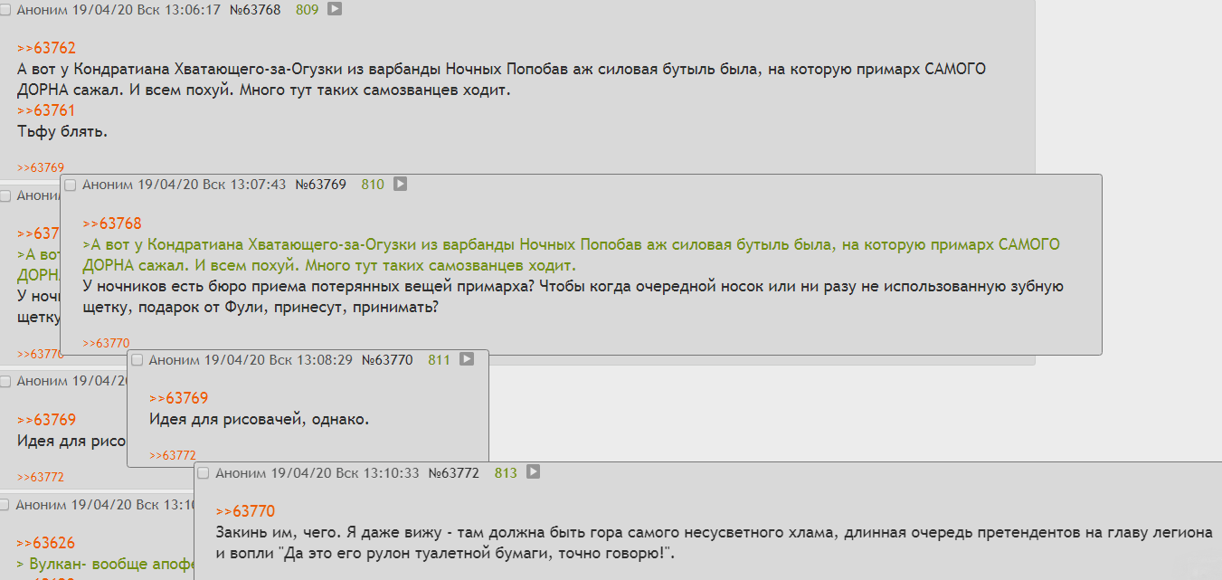 Идеи примерно такие: Хренд, гачи-дарки, поэмы Льва, сахарные эльдар под ручку с Серыми, продавцы топоров, нипридавал, Уд Раскиян, Ариман Сладостный, а дальше сами думайте.