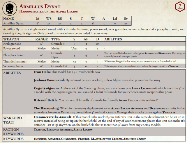 Legion Traits (AL) • Mutable Tactics: Before setting up your first unit, pick one ability from the list below. All alPha legIon astartes units gain this ability for the rest of the battle. • Feigned Deployment: At the start of the first battle round but before the first turn begins, you can move this unit up to 6”. It cannot end this move within 9” of any enemy models. If both players have units that can do this, the player who is taking the first turn moves their units first. • Advance Deployment: When you set up this unit during deployment, it can be set up anywhere on the battlefield that is more than 18” from any enemy models. • Technical Secrets: When targetting enemy Vehicles, this unit may re-roll Wound rolls of 1. • Combat Stimulants: If this unit charged or was charged in the Charge phase, it may re-roll Hit rolls of 1 in the following Fight phase. • Advance Surveying: This unit ignores any negative effects from Battlefield Terrain. • Martial Hubris: If an army containing an alPha legIon Detachment has suffered more destroyed units than the enemy army at the end of the game then it gives the opponent +1 VP.