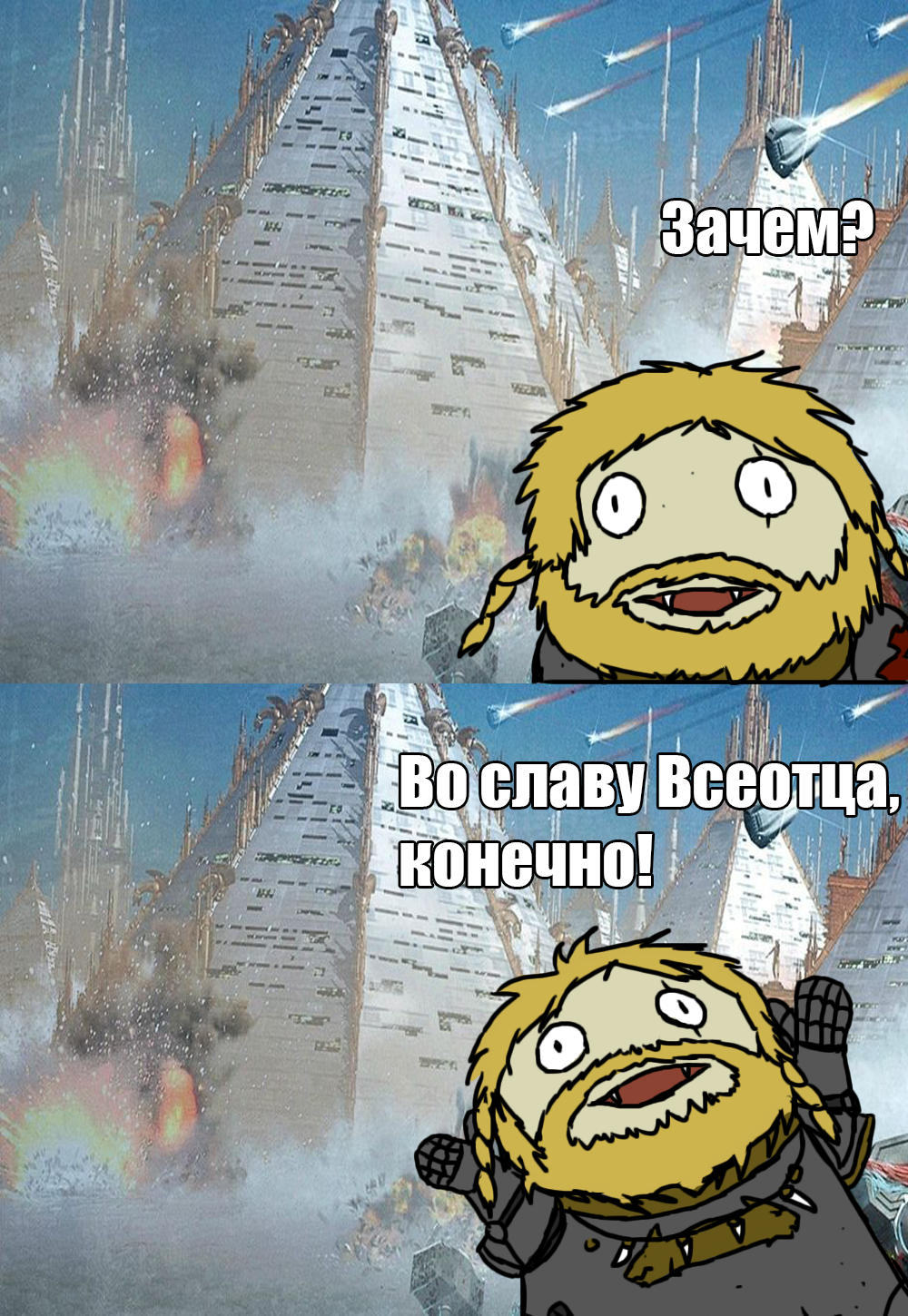 >>80270 - Солдаты СПО, к вам обращается Священное Сестринство. Мы прибыли к вам на помощь в борьбе с проклятыми еретиками! - Ура! Мы спасены! - Всегда думаешь только о себе. - Что? Не понял. Нас атакуют культисты! Нужна помощь! - То есть моё мнение для тебя пустое место? - Мы под сильным огнём. Скажите, свои координаты. - Ты мне скажи. Ты ж у нас всегда самый умный. - В чём проблема? - Да ни в чём уже. - Лучше б я был сервитором.