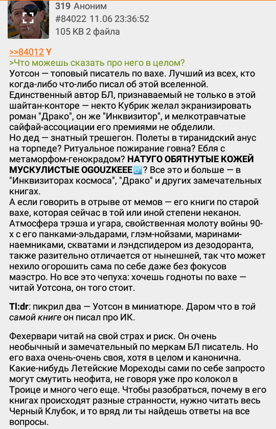 Читаю сейчас "забытые сыны", и это неописуемо, потому как божественно. Бывшая планета ЖВ собирается выбирать, присоединиться к Воителю или Империуму. Для этого организовали МИРНЫЕ ПЕРЕГОВОРЫ трех сторон в формате какого-то рэп-баттла. Там ИТЕРАТОР ХОРУСА обвинял Императора в ВОЕННЫХ ПРЕСТУПЛЕНИЯХ, в частности ИЗНАСИЛОВАНИИ МОНАРХИИ и СОЖЖЕНИИ ПРОСПЕРО даже намекая что НИПРИДОВАЛ. После одной удачной наебки, кстати, думал про себя, что "сам Эреб не справился бы лучше". А на фоне шизоидная многоходов_очька ассасина, оказавшегося ЗАМАСКИРОВАННЫМ КУСТОДИЕМ, который на самом деле был замаскированым альфарием полиморфом. Что нужно было для прикрытия диверсанта ЖВ, шатающего в это время подземные ядерные реакторы.