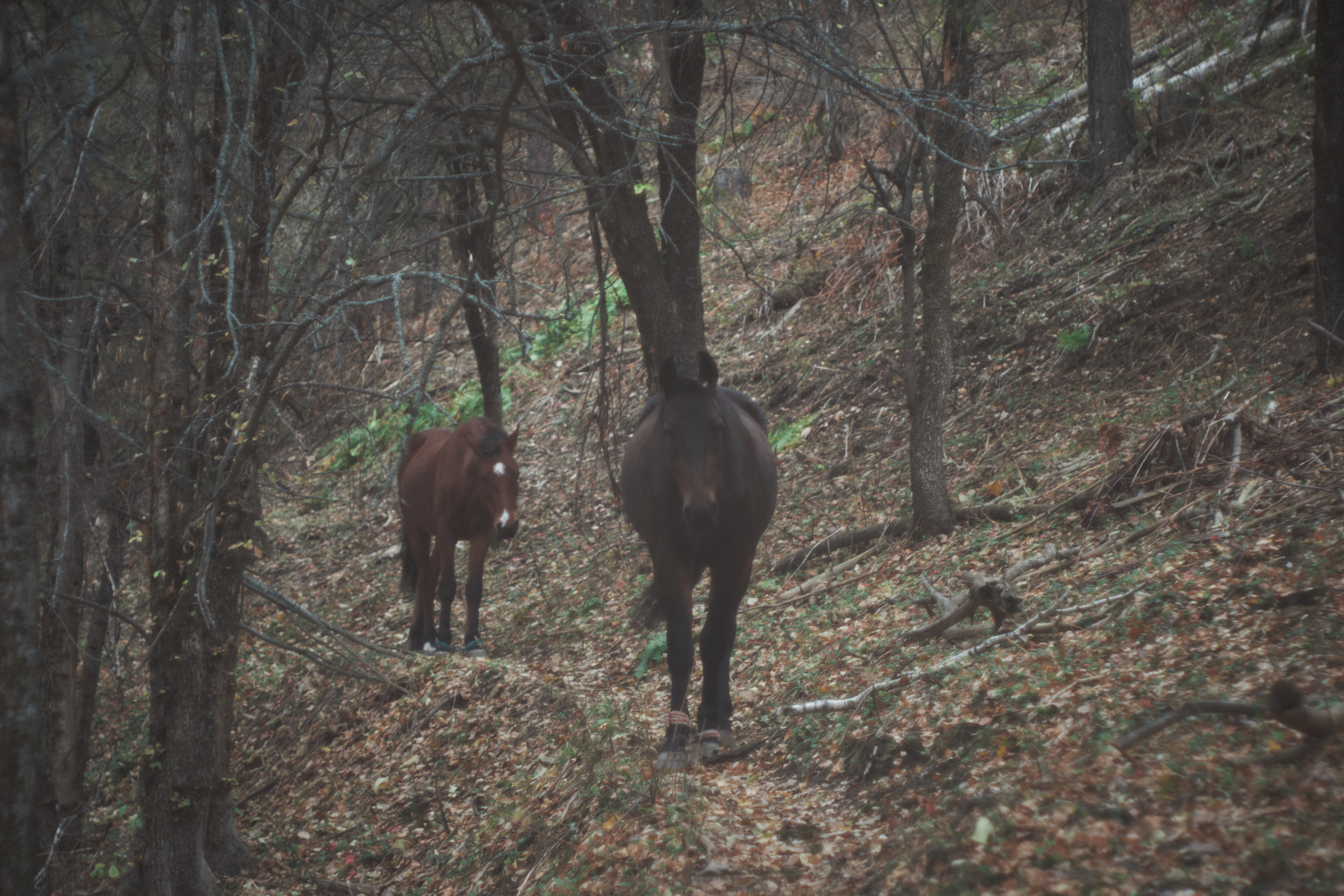 Их достаточно много. Примерно каждый второй раз, когда я хожу в горы, встречаются лошади. Но чаще они издалека на тебя посмотрят и дальше побегут своей дорогой. Да и страшновато самому подходить к лошадям, особенно когда они с жеребятами. Мало ли что им в голову взбредёт, потом будешь валяться в нокауте далеко в горах.