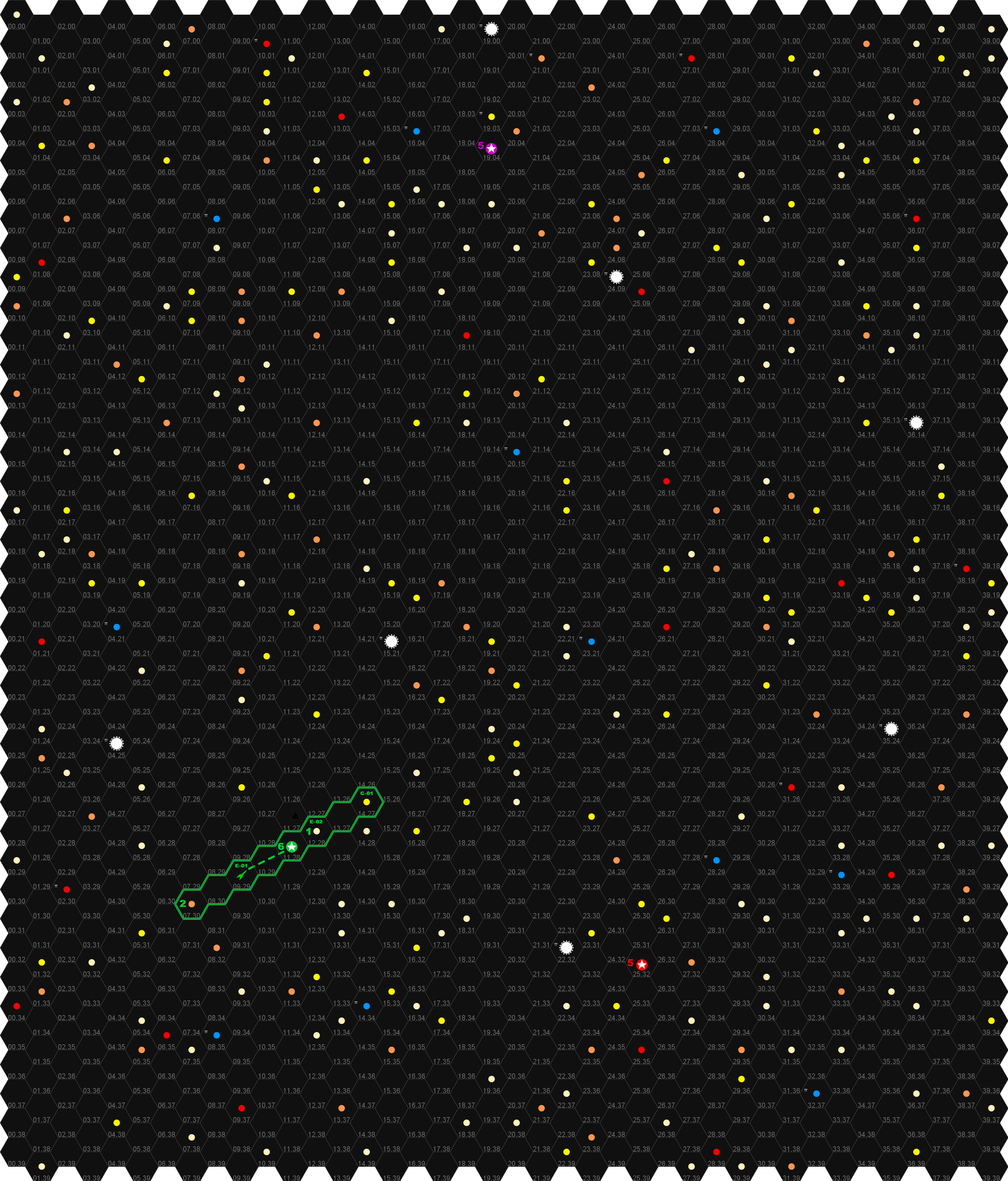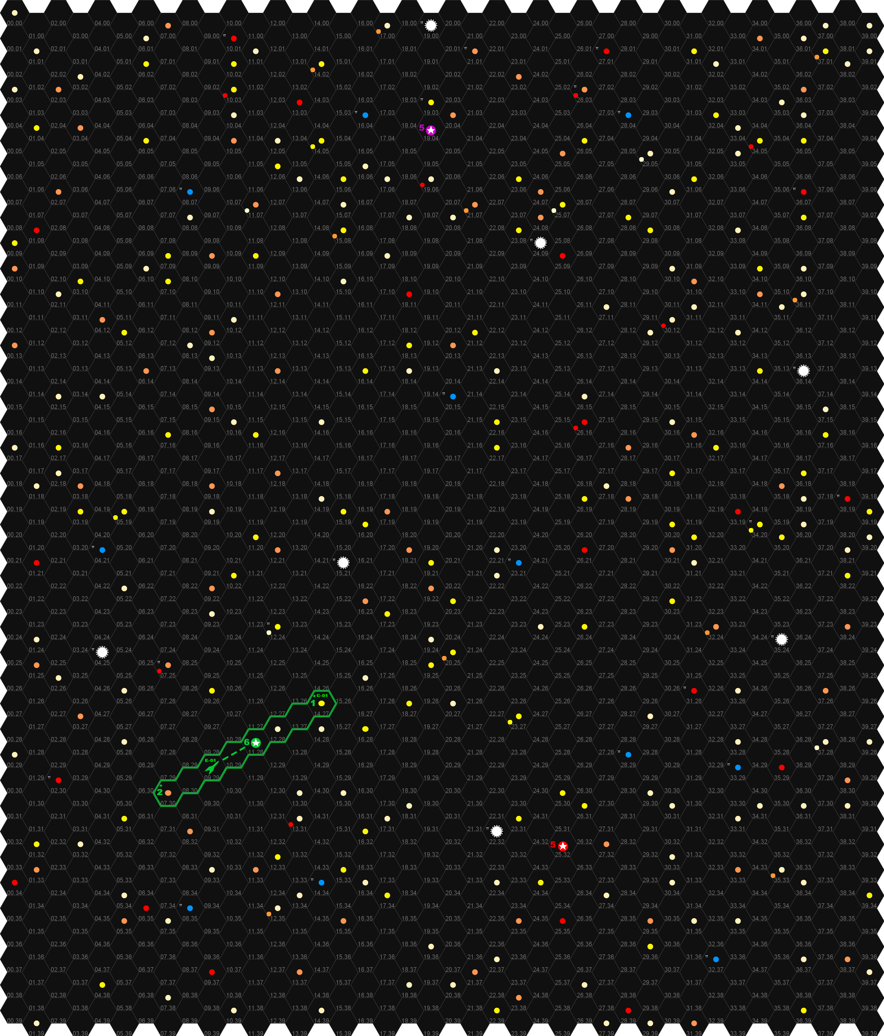 На одном гксе может быть сколько угодно кораблей, но я считаю что лучше ограничить число до 10-20, зато на картах планетарной системы можно разгуляться. См. картинку, я могу так для каждой системы сделать: в каждом гексе кроме звезды, планет и спутников может быть космический корабль, за планетами можно прятаться, за астероидами тоже, но если между кораблями нет препятствий то можно валить друг друга, ограничений по дальности ведения огня быть не должно, ну если только для ракет и бомб?