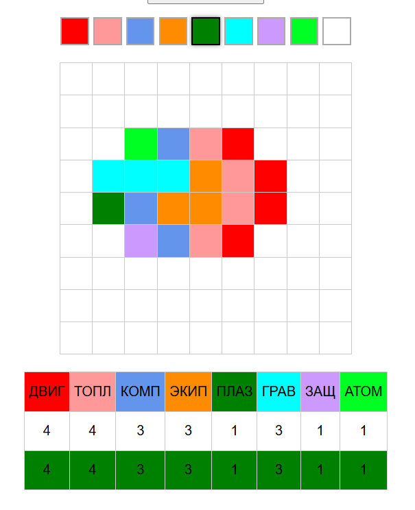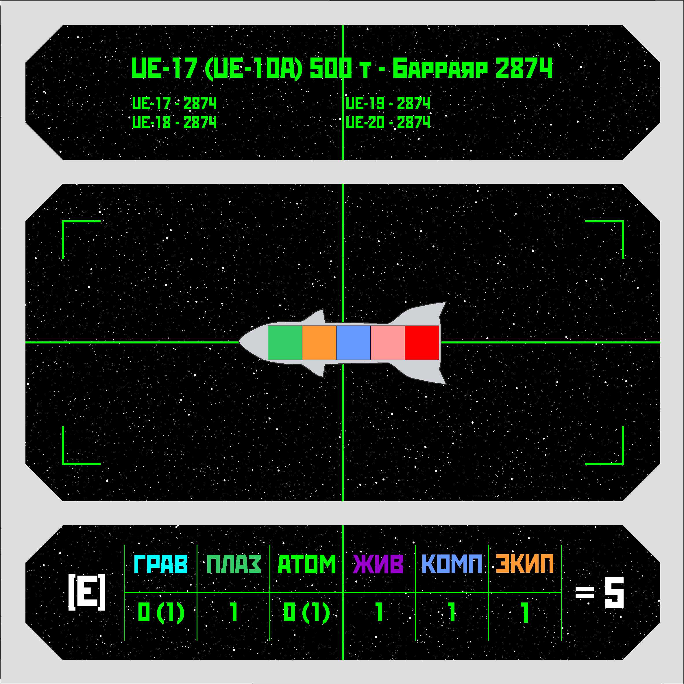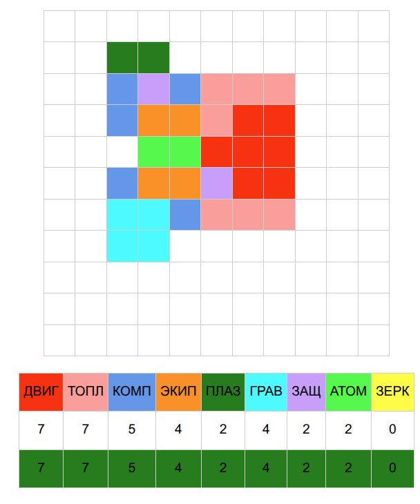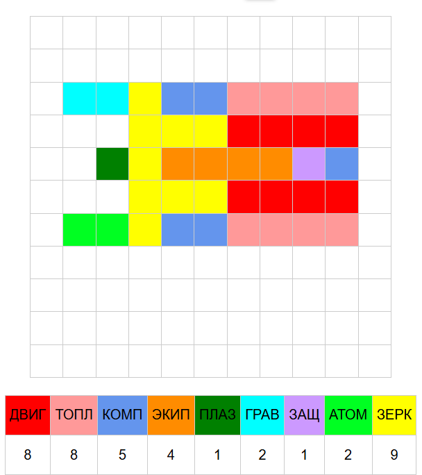 >>680696 ИГ = Искусственная гравитация. Уровень боевой мощи (БМ) для гравиганов (голубой цвет на схеме). ФП = Физика плазмы. Уровень БМ для плазмаганов (ярко-зеленый цвет на схеме). ЯФ = Ядерная физика. На корабле нет Р-зарядов, поэтому в графе стоит нолик. ПС = Пропульсивные системы (двигатели - красный цвет на схеме, топливо - розовый). БзЖ = Борьба за живучесть. Уровень БМ для ионных экранов (фиолетовый цвет на схеме). СиК = Сенсоры и компьютеры. Уровень БМ для бортовых систем (синий цвет на схеме). ТиО = Тактика и организация. Уровень БМ для экипажа (оранжевый цвет на схеме). Желтый на схеме - модуль плазменного зеркала (хуетень, которая делает корабль линкором).