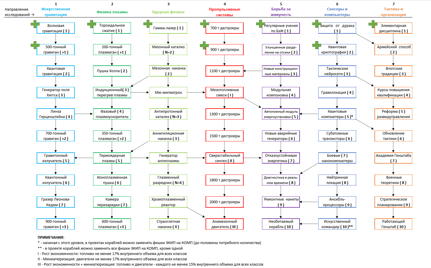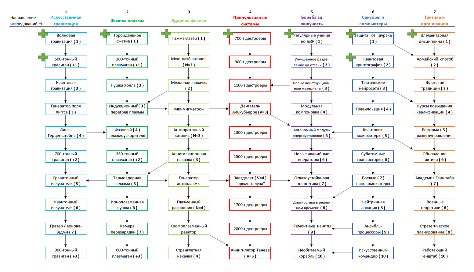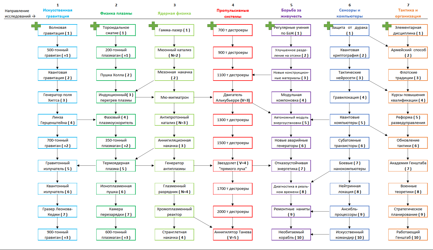 >>681344 >еще раз подробно что на что влияет Открой картинку с технологиями. Там семь колонок, помеченных разными цветами. Каждой колонке соответствуют клеточки того же цвета на схеме корабля. Исследуя техи из оранжевой ветки "Тактика и организация", ты прокачиваешь экипаж корабля. Исследуя техи из голубой ветки "Искусственная гравитация", ты прокачиваешь корабельные гравиганы. И т.д.