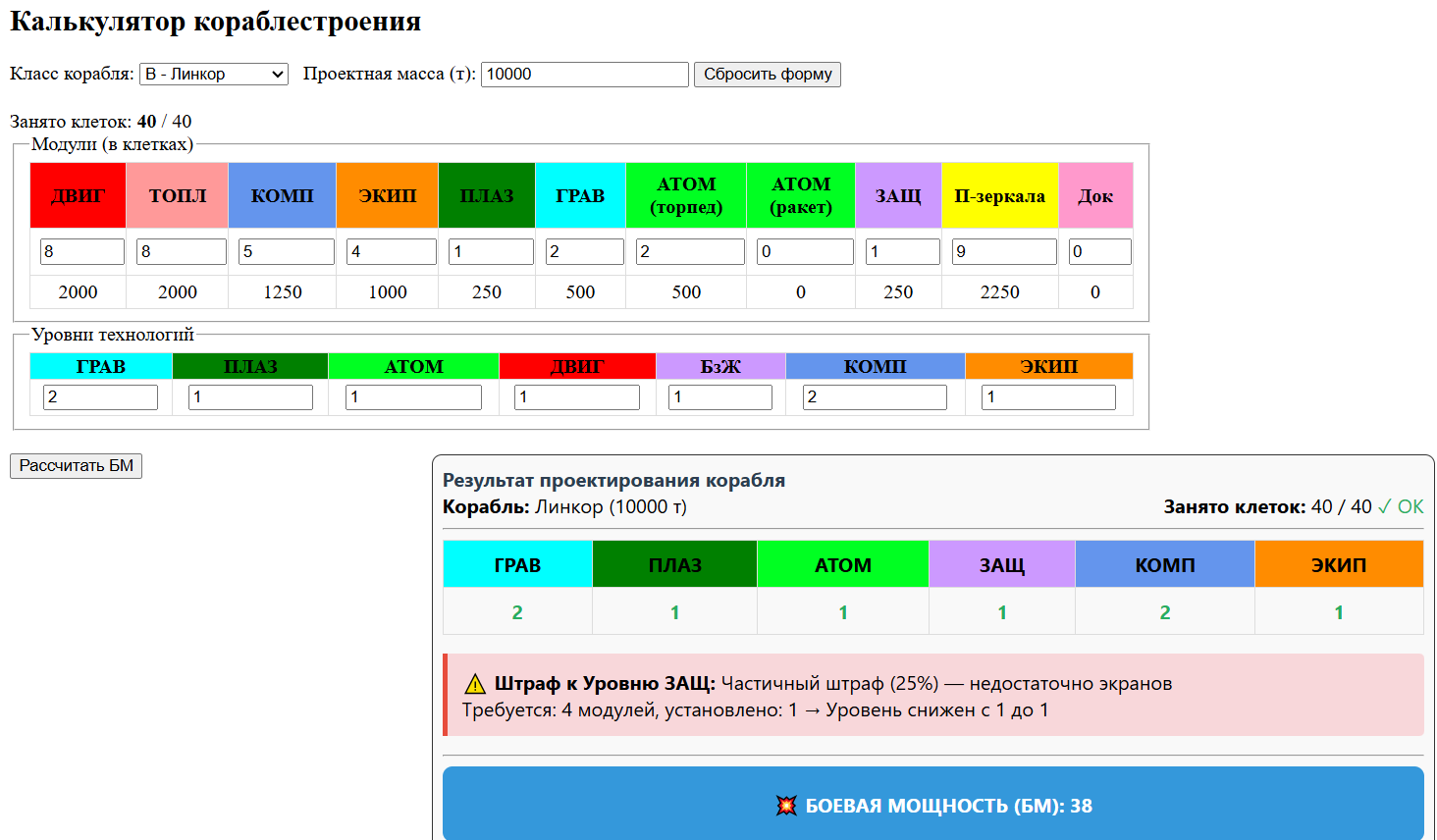 Если в скобках стоит не (N), а (+N), то это оборудование добавит еще +N баллов к БМ. Лично ты на прошлом ходу открыл теху "200-тонный плазмаган (+1)" и поставил его на свой новый крейсер (2 зеленые клетки в носу). С этим оружием БМ "Эволюции" = 5. Если бы вместо 200-тонного стоял базовый 100-тонный плазмаган (размером 1 клетка), то БМ была бы только 4.