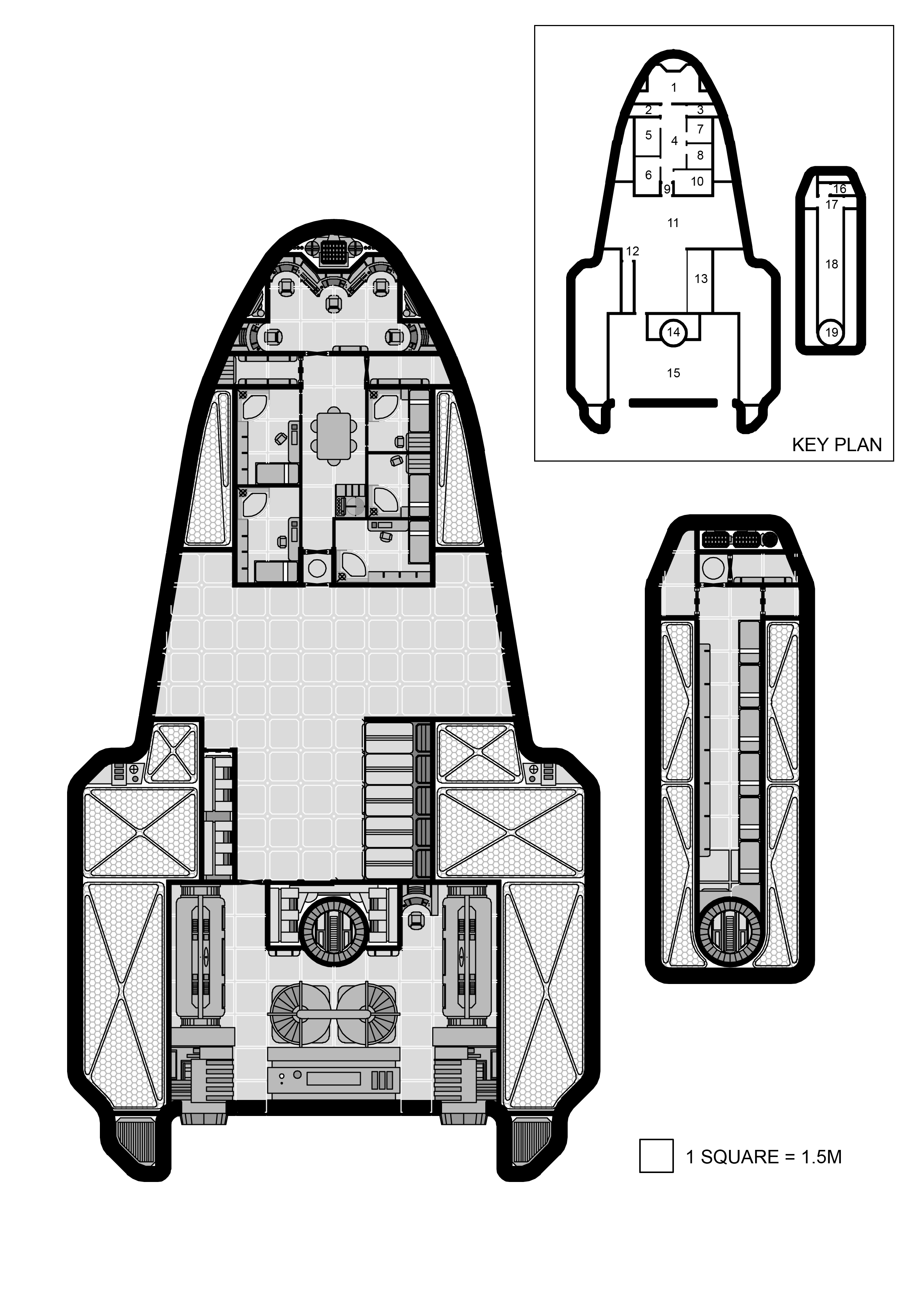 Размер корабля - 12. (60) 1) Кабина управления (Мостик) (5) 2) Грузовой трюм (3) 3) Двигатель (10) 4) Жилой отсек (3) 5) Боевая часть (5) 6) Ремонтный модуль (5) 7) Медицинский отсек (5) 8) - 9) - 10) - 11) - 12) -