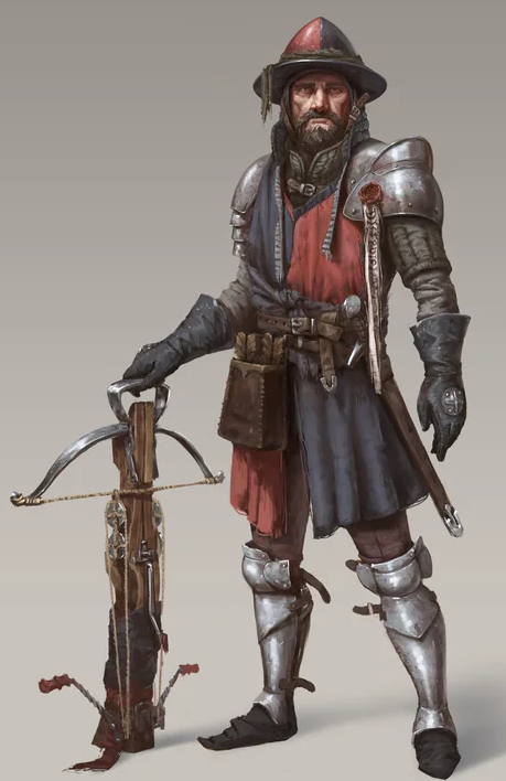 Недостаток: Суеверный. Герхардт боится покойников, чудовищ и прочей жути. Навыки воителя: Нападение: Выстрел из арбалета (6д12) Защита: Уклонение (4д12) Контроль: Пинок (5д12) Если враг подобрался близко, Герхардт отталкивает его прочь.
