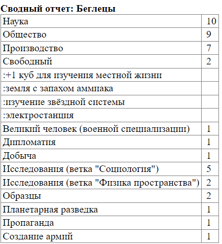 Кароч получается единственный успех в первой попытки на этом ходу это "Новые способы пропаганды". Я раньше не пытался ее изучать и теперь вот изучил. Остальные успехи это либо со второй попытки, либо устранение последствий распиздяйства населения. На первом ходу таких было 4, на втором и третьем по 5. У меня тоже своя таблица в экселе идет.