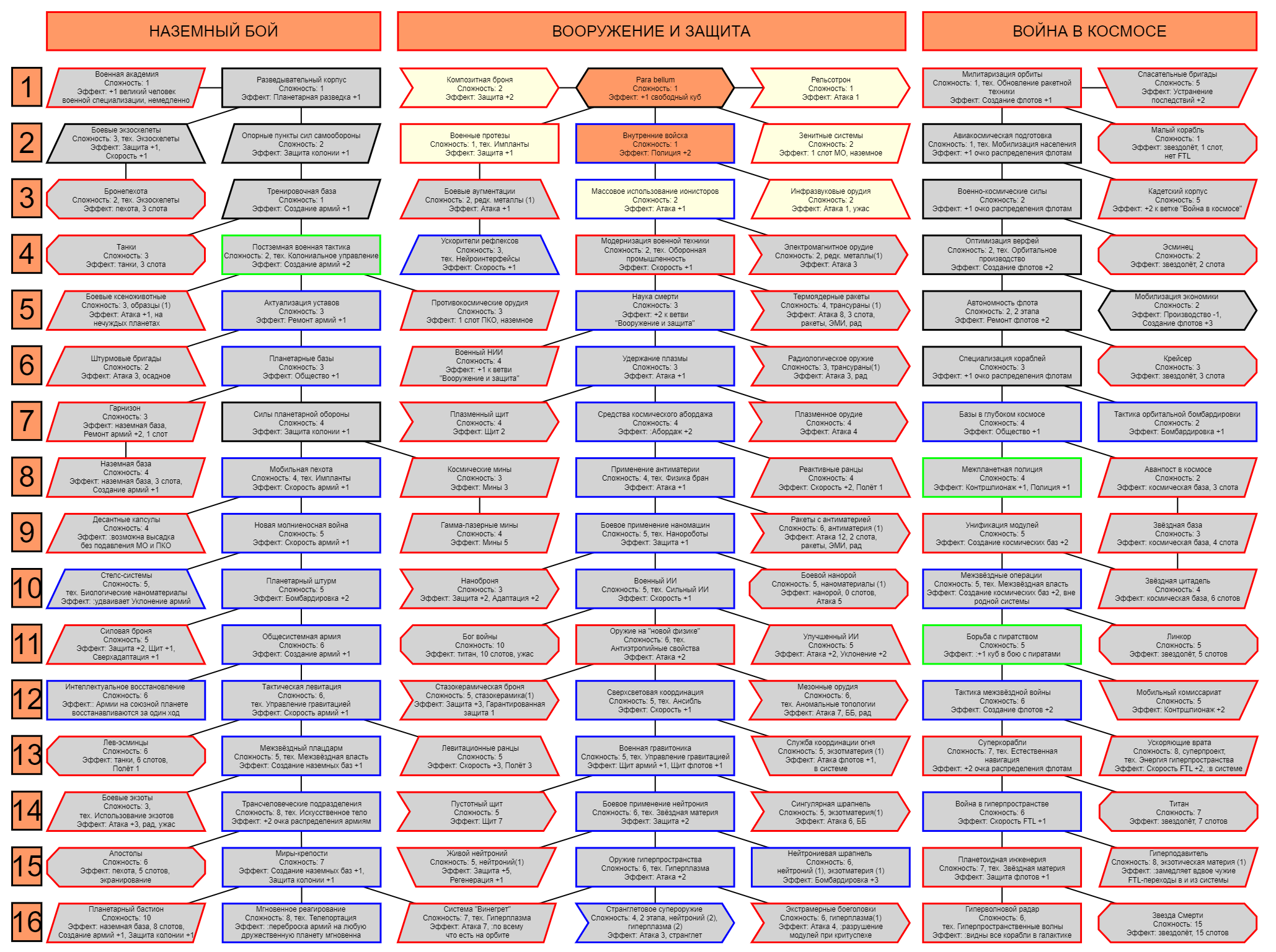 >>704081 > для каждой экосистемы отдельная технология/проект? Игромеханически не предусмотрено, так что один на всë > Строительство кораблей без "Милитаризации орбиты" невозможно? Например каких-нибудь гражданских корыт для разведки, грузоперевозки и добычи? Ниже все правильно сказали, игромеханически - нет. Так в теории корабли начинают строиться сами где-то после Освоения орбиты, но этот никак нигде не отражается. А тебе зачем собственно? > Почему восемь? Вроде ж 4 должно быть Потому что из-за моего косяка в правилах было написано что люди дают свой бонус к любому количеству проектов, а не один раз, как остальные кубы. Вот поэтому.