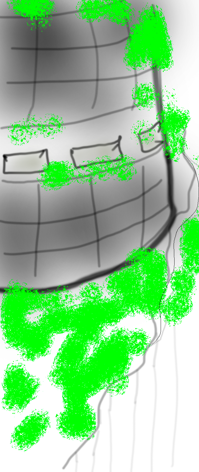 >>710758 Пульсирующий камень мягко сел в отверстие, будто намагниченный; дверь дрогнула и створки медленно отворились. Камушек опять упал в ладонь. Внутри царила темнота, лишь тонкие лучи света рассеивались откуда-то с потолка. Стены изнутри были покрыты какой-то ярко пахнущей зеленью, а в центре, чуть дальше столбов из поблескивающего камня, находилась яма. Над ямой свисали лианы, а в ней, углубленной на добрый десяток локтей, находился тяжело дышащий бородатый гигант. Его тело было сковано - руки зафиксированы лианами, а в ступни были вбиты сваи. С него свисали какие-то тряпки, на которых угадывались дварфийские традиционные узоры. Позади него валялось множество продолговатых предметов, теряющихся в сумраке, и две антропоморфные тени... Глаза эльфа, видящие в темноте так же хорошо, как и днем, определили, что это сгнившие растения - но почему они так походили на эльфов? Глаза гиганта были завязаны а грудь распорота двумя зубьями - в месте, где должно находиться сердце, слегка мигая, находилась крошечная желтая сфера - в ней что-то двигалось... Часть лиан, подрагивая, окутывали сферу, будто выкачивая из нее жидкость, которой сфера наполнялась вновь и вновь.