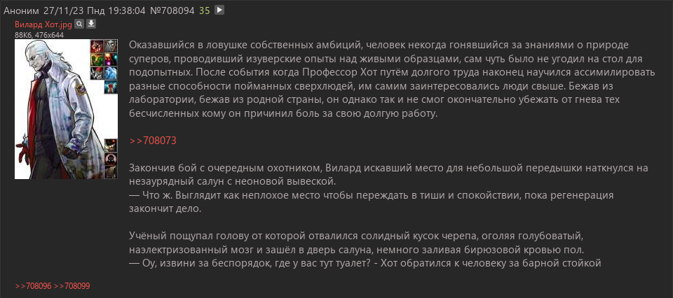 >>712663 Пост вката. Домой вернусь вечером и допилю аватарки со способностями. Готов ждать пока ГМ не придумает как меня воткнуть в игру, или как это у вас туту происходит. Боль. Я помню, как моё тело пожирали само себя - и как день за днём я перестал узнавать себя в белом отражении стен своей камеры. Я помню тех ублюдков, что приковали меня к столу. Когда-то я звал их братьями по оружию - мы прикрывали друг другу спины и вытаскивали из-под огня противника. Но у наемников, как и у воров, нет чести когда дело касается денег. Я помню тех, кто наблюдал за мной из-за одностороннего бронированного стекла. Их медицинские маски, очки и халаты. Их руки, что держали шприцы, скальпели и пилы. Со временем я перестал чувствовать боль - ярость чертовски хороший анестетик. Они кормили меня сырым мясом, и я становился сильнее. Они бросали мне в камеру живых существ, и я рвал их на куски руками, что постепенно теряли свой человеческий вид, отращивая когти, шипы и броню. Они кормили меня падалью, и я становился падальщиком. Они заставляли меня бороться с хищниками, и я карабкался до вершины пищевой цепи. Моё тело менялось с каждым съеденным куском мяса, каждым глотком тёплой крови - я перестал быть человеком, скорее нечто чем-то отдалённо похожим. Мои вены отдавали тусклый красный свет, одежда переплеталась с кожей и мышцами, различные костные отростки вырывались из моего тела, сопровождаясь брызгами кипящей от ускоренного деления клеток крови. Я становился монстром, вершиной эволюции, детищем безумия и безконтрольного научного прогресса в равных долях. И теперь, я свободен. Возможно, пожирая людей, я смогу вернуть себе человечность.