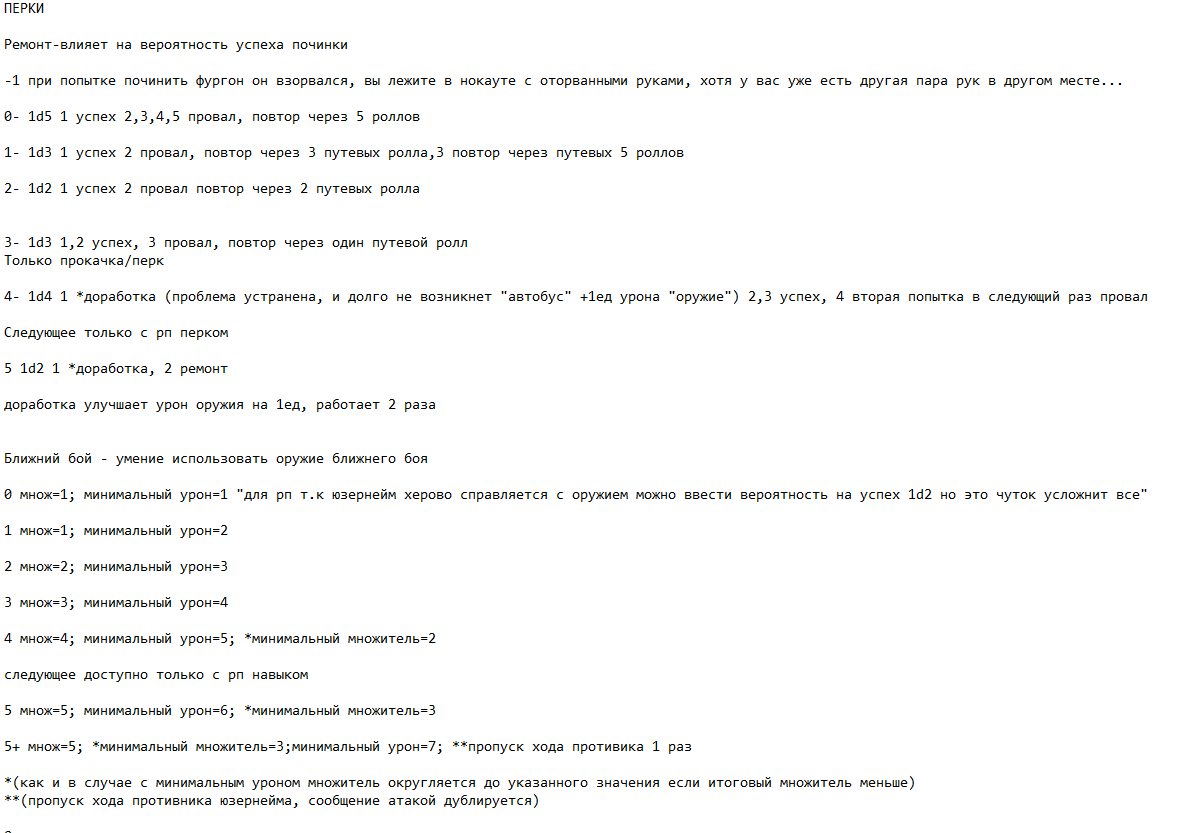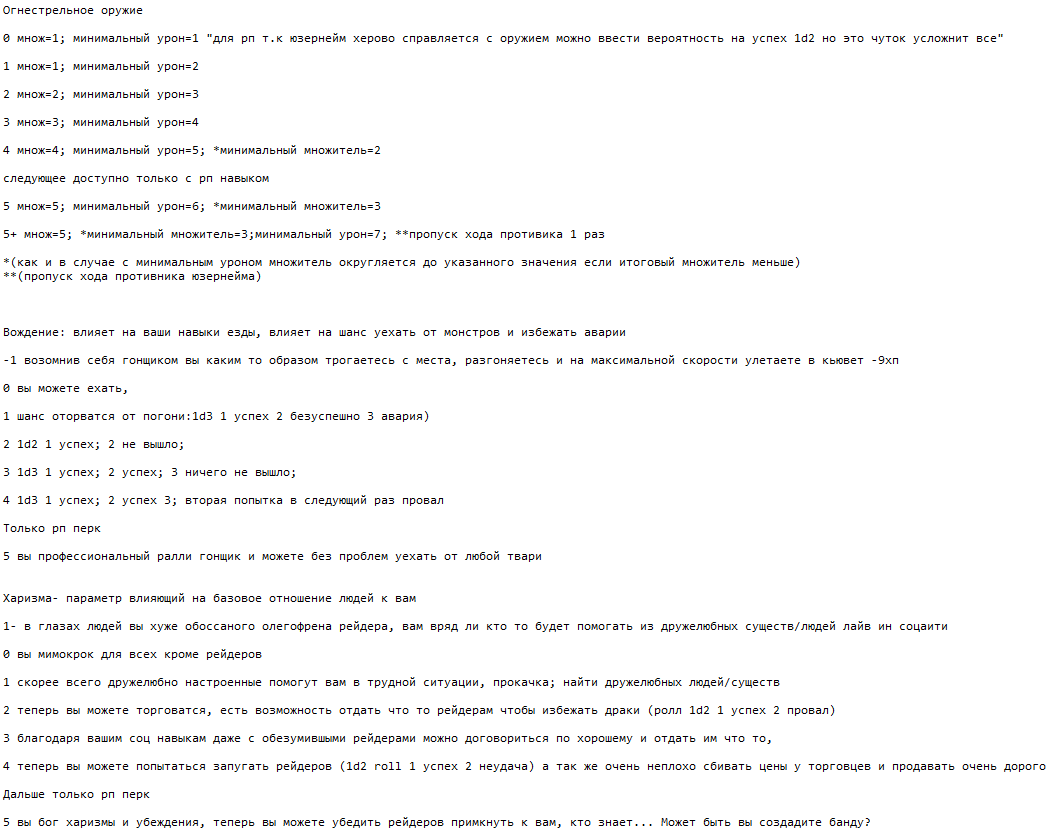 >>725327 >скрипт Это просто html - архив самого первого тогда. Там в самом низу правила, подписаны как "Статы", "Фургон-база", посмотри, там их штук восемь. Актуальны файлы с расширением .docx!