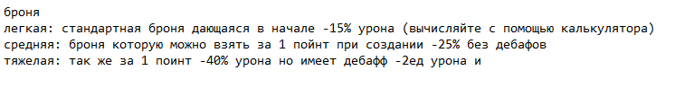 >>711913 Заметьте, разделение пробелами на блоки очень сильно упрощает восприятие информации, в прочем можете играть и не по шаблону просто вот такое строгое оформление создаст более серьезный вид игре что ли и упростит восприятие информации, самое главное вы уже прохавали и это хорошо