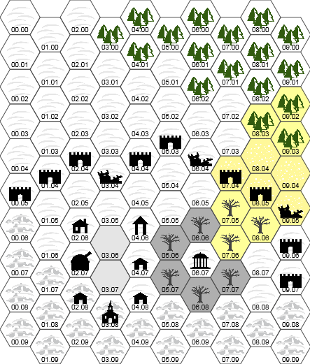 Начальная локация выглядит так На гексах находятся: 03.08 Обитель ордена, представляет из себя капитальное здание с древней историей. В подвале располагаются столовая, покои братьев и ряд хозяйственных комнат. Этот уровень является единственным, который отапливается на постоянной основе. Ниже, в крипте, находятся ферма для растений и грибов, хотя большинство грибов произрастают самостоятельно на стенах крипты. На первом этаже расположён реликварий и главный зал, предназначенный для молитв и обрядов, а на втором этаже находится комната в котором веками совещались и принимали решения. Кабинеты глав, лазарет и обширная библиотека, занимающая большую часть этого этажа. На чердаке, где установлен церковный колокол, который хоть и небольшой, но благодаря выдающимся архитектурным решениям строителей, чердак функционирует как мощный звуковой резонатор. Колокол давно не использовался, чтобы избежать привлечения ненужного внимания. 02.08 К обители примыкает склад, в котором находится сломанный генератор. В этом же здании размещены мясницкая и ледник, где хранится мясо. На чердаке раньше располагалась голубятня, однако текущее состояние этого помещения вам неизвестно. 02.07 Обсерватория, оборудованная телескопом, сохранилась благодаря брату Зефиру, который часто посещал это место для наблюдения за звёздами, что позволило избежать разрушительных последствий времени. 02.06 Двухэтажное общежитие, в котором когда-то обитали странствующие путники и слуги ордена, ныне находится в полуразрушенном состоянии. Чердак, вероятно, завален снегом, это здание посещал лишь оракул, который, однако, из-за ухудшения здоровья не появлялся здесь уже последние два года. 03.06 - 03.07 На плацу братья собирались для утренних молитв и получения наставлений от старших. В настоящее время плац покрыт снегом, и вас стало слишком мало, чтобы поддерживать порядок на прилегающей территории. 04.08 Мастерская, где изготавливались простые металлические изделия, славилась мастерством ваших братьев, которые превращали даже обычный гвоздь в произведение искусства. 04.07 На первом этаже винокурни располагалась кустарная лаборатория, обитель алхимика. В подвале когда-то производили вино и хранились алкогольные напитки. Последний раз на двери висел амбарный замок, что подчеркивает её длительное забвение. 04.06 Ботанический сад, оснащенный системой контроля температуры. когда то служил местом, где ваши братья выращивали редкие растения, используемые в рецептах алхимии. Сейчас же он заброшен, требует ремонта и электричества