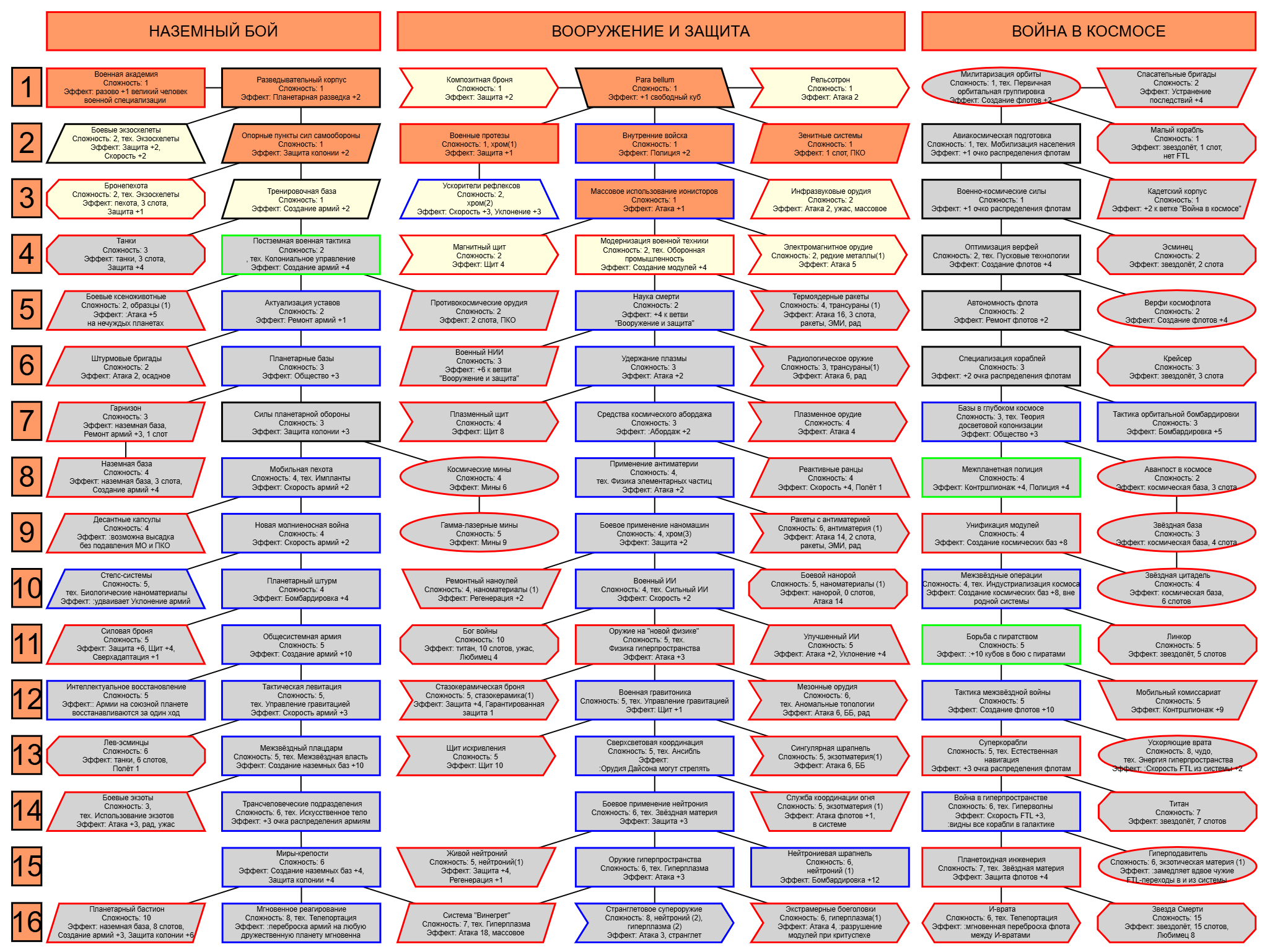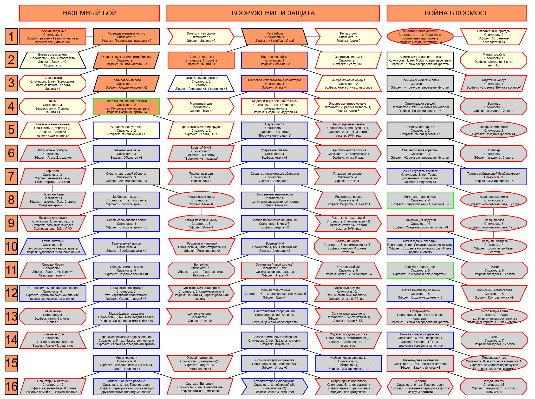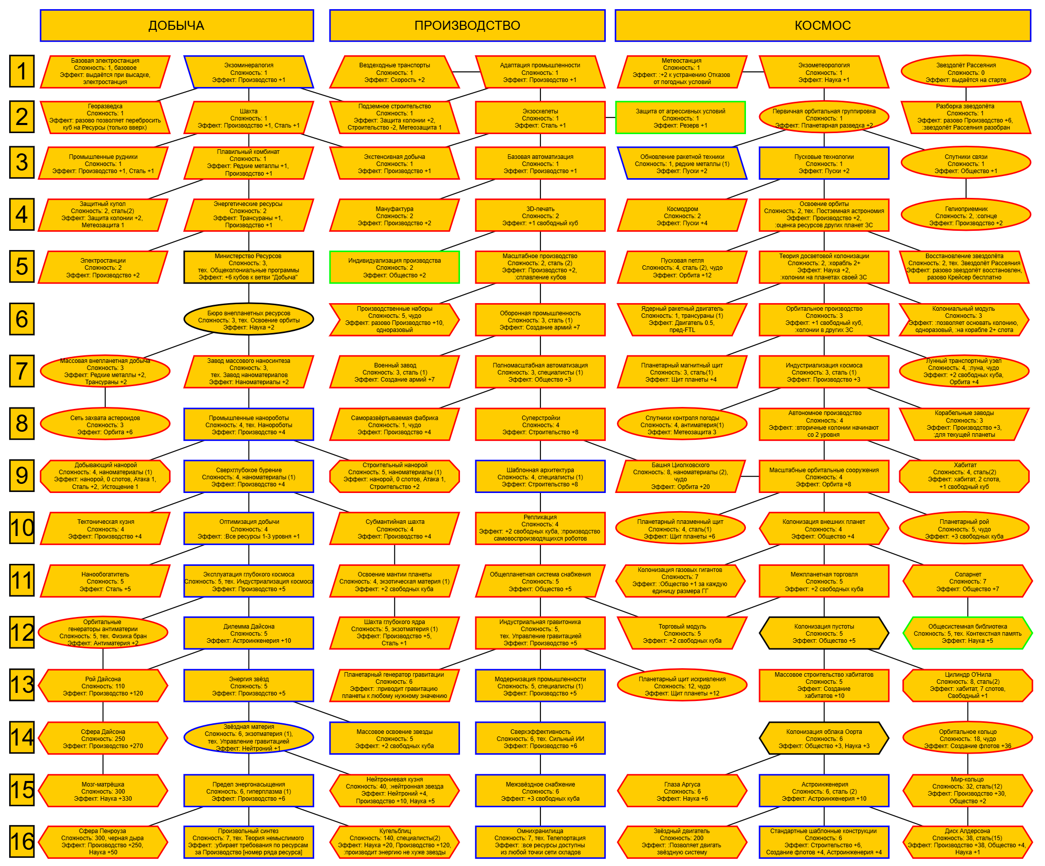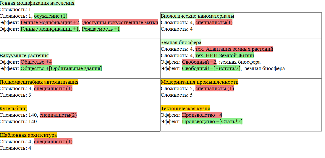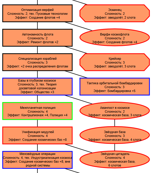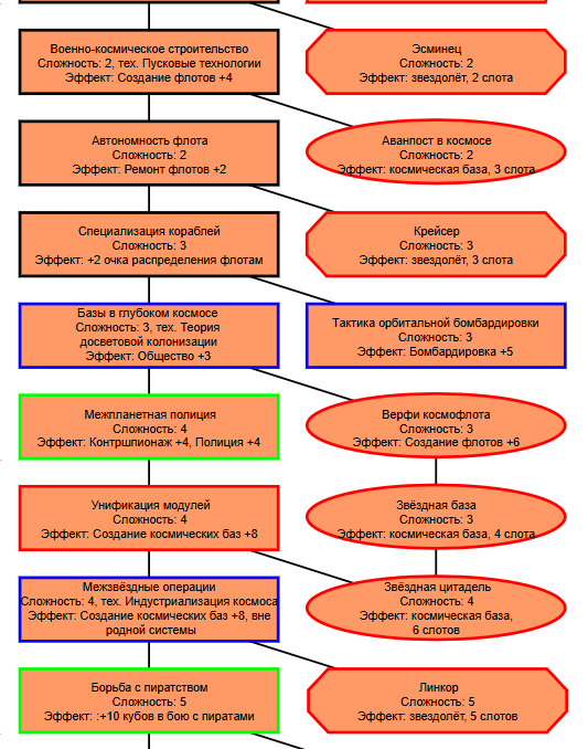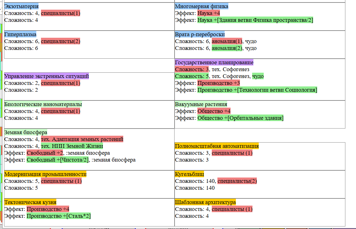 Экзобиология Земная биосфера 4 - Свободный +[Чистота] хром и гмо земную биосферу не красят, а вот чистота да Генетика Вакуумные растения 4 - Общество +[орбитальные здания] Физика пространства Многомерная физика 4 - Наука +[здания Физики пространства/2] чем больше испытаний и лабораторий, тем больше мы понимаем, а кукаретиков всегда навалом Компьютеры Ограниченный ИИ 4 - Свободный +[техи компьютеров/2] Импланты Клиника нанохирургии 4 - Общество +[наноматериалы+трансураны+редкие металлы] ([нм+ту+рм]) богатства недр принадлежат народу в конце концов Добыча Тектоническая кузня 4 - Производство +[Сталь] кузня ух боя, всем кузням кузня, только и успевайте завозить металл Производство Военный завод 3 - Создание армий +[техи Производства] Космос Планетарный плазменный щит 4 - Щит планеты +[орбитальные здания/2] здания на орбите поддерживают щит, очень удобно Наземный бой Стелс-системы 5 - Уклонение армии*2 оно так и было Вооружение и защита Средства космического абордажа 3 - абордаж +[адаптация/2 + сверхадаптация] привет юнитологам Война в космосе Межпланетная полиция 4 - контршпионаж и полиция +[Конверсия/2] типа в межпланетном пространстве при нехватке службистов поощряется друдинство и активная гражданская пощиция в борьбе с нарушителями Государство Государственное планирование 5 - Производство +[техи социологии] Социология Состояние безветрия 4 - Наука +[Защита колонии/2], Защита колонии +2 Ваши ученые не сбегут расщеплять атом к Илонию, если их не бомбят коммунисты
