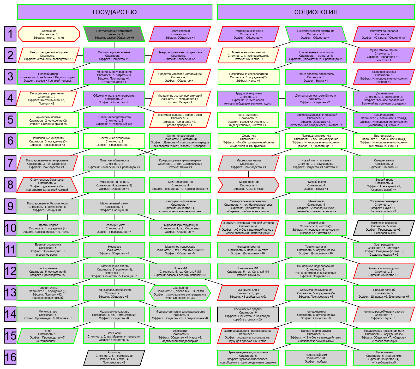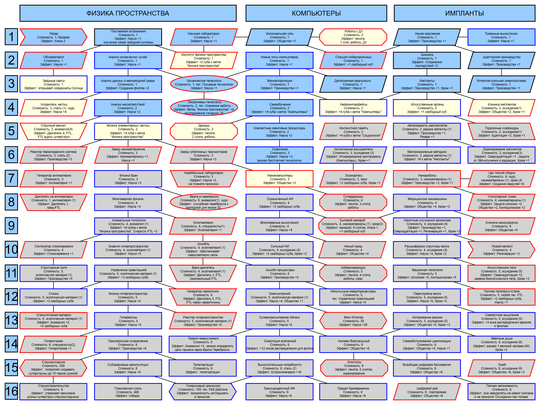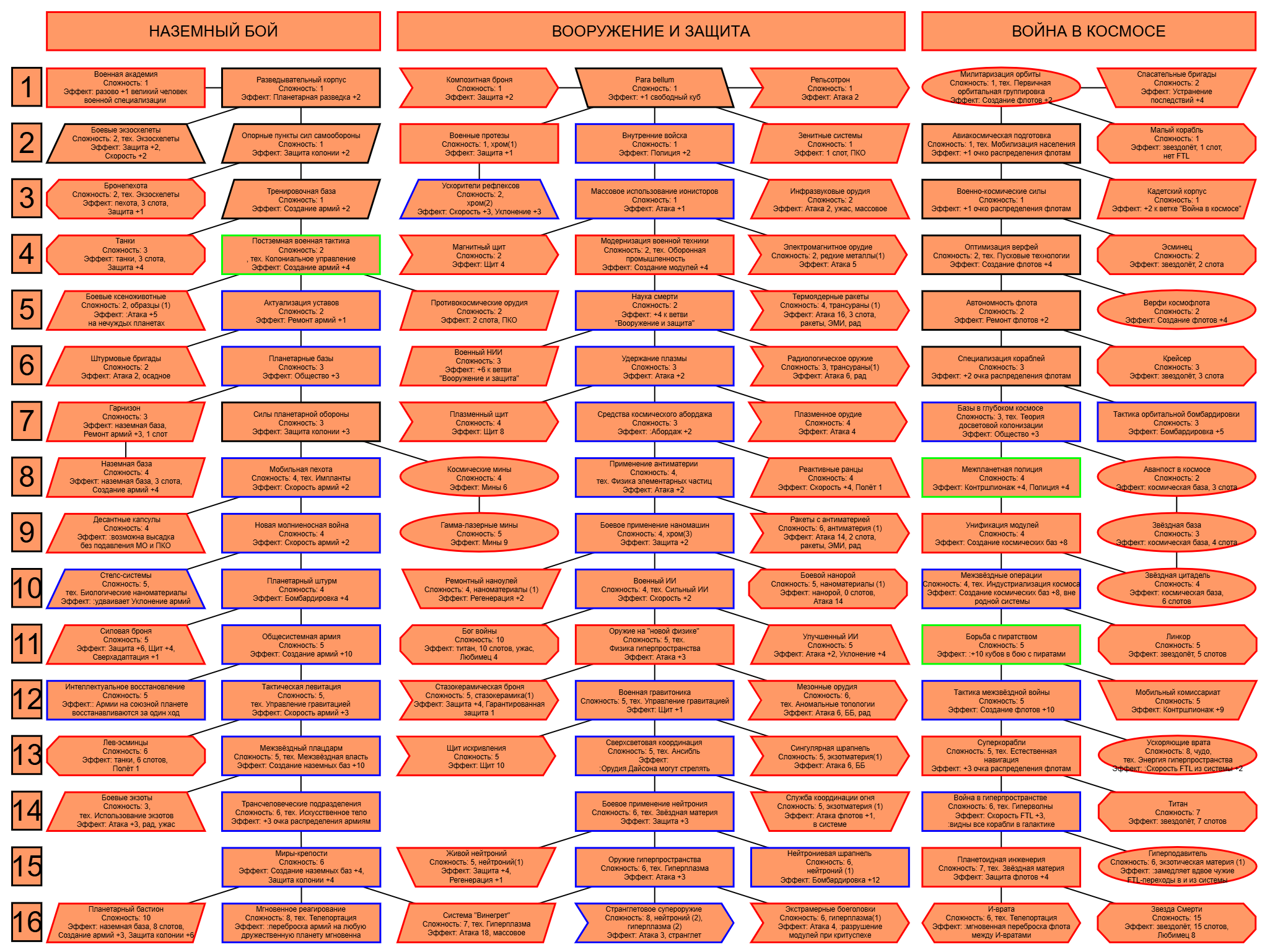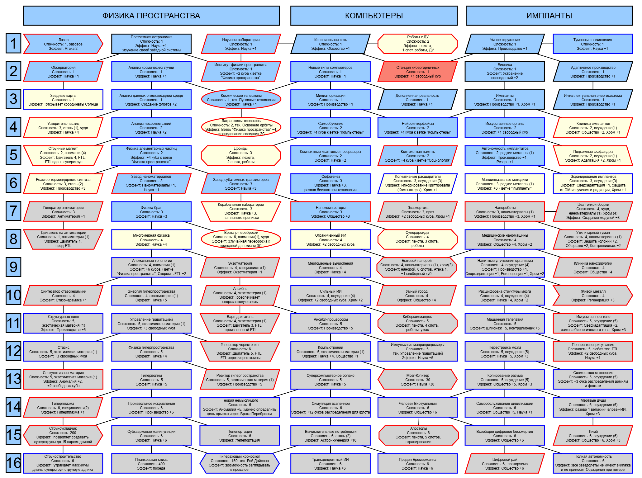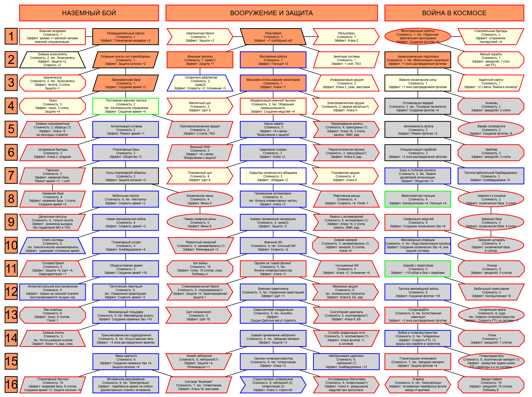 Экзобиология Земная биосфера 4 - Свободный +[Чистота] хром и гмо земную биосферу не красят, а вот чистота да Генетика Вакуумные растения 4 - Общество +[орбитальные здания] Физика пространства Многомерная физика 4 - Наука +[здания Физики пространства/2] чем больше испытаний и лабораторий, тем больше мы понимаем, а кукаретиков всегда навалом Компьютеры Ограниченный ИИ 4 - Свободный +[техи компьютеров/2] Импланты Клиника нанохирургии 4 - Общество +[наноматериалы+трансураны+редкие металлы] ([нм+ту+рм]) богатства недр принадлежат народу в конце концов Добыча Тектоническая кузня 4 - Производство +[Сталь] кузня ух боя, всем кузням кузня, только и успевайте завозить металл Производство Военный завод 3 - Создание армий +[техи Производства] Космос Планетарный плазменный щит 4 - Щит планеты +[орбитальные здания/2] здания на орбите поддерживают щит, очень удобно Наземный бой Стелс-системы 5 - Уклонение армии*2 оно так и было Вооружение и защита Средства космического абордажа 3 - абордаж +[адаптация/2 + сверхадаптация] привет юнитологам Война в космосе Межпланетная полиция 4 - контршпионаж и полиция +[Конверсия/2] типа в межпланетном пространстве при нехватке службистов поощряется друдинство и активная гражданская пощиция в борьбе с нарушителями Государство Государственное планирование 5 - Производство +[техи социологии] Социология Состояние безветрия 4 - Наука +[Защита колонии/2], Защита колонии +2 Ваши ученые не сбегут расщеплять атом к Илонию, если их не бомбят коммунисты