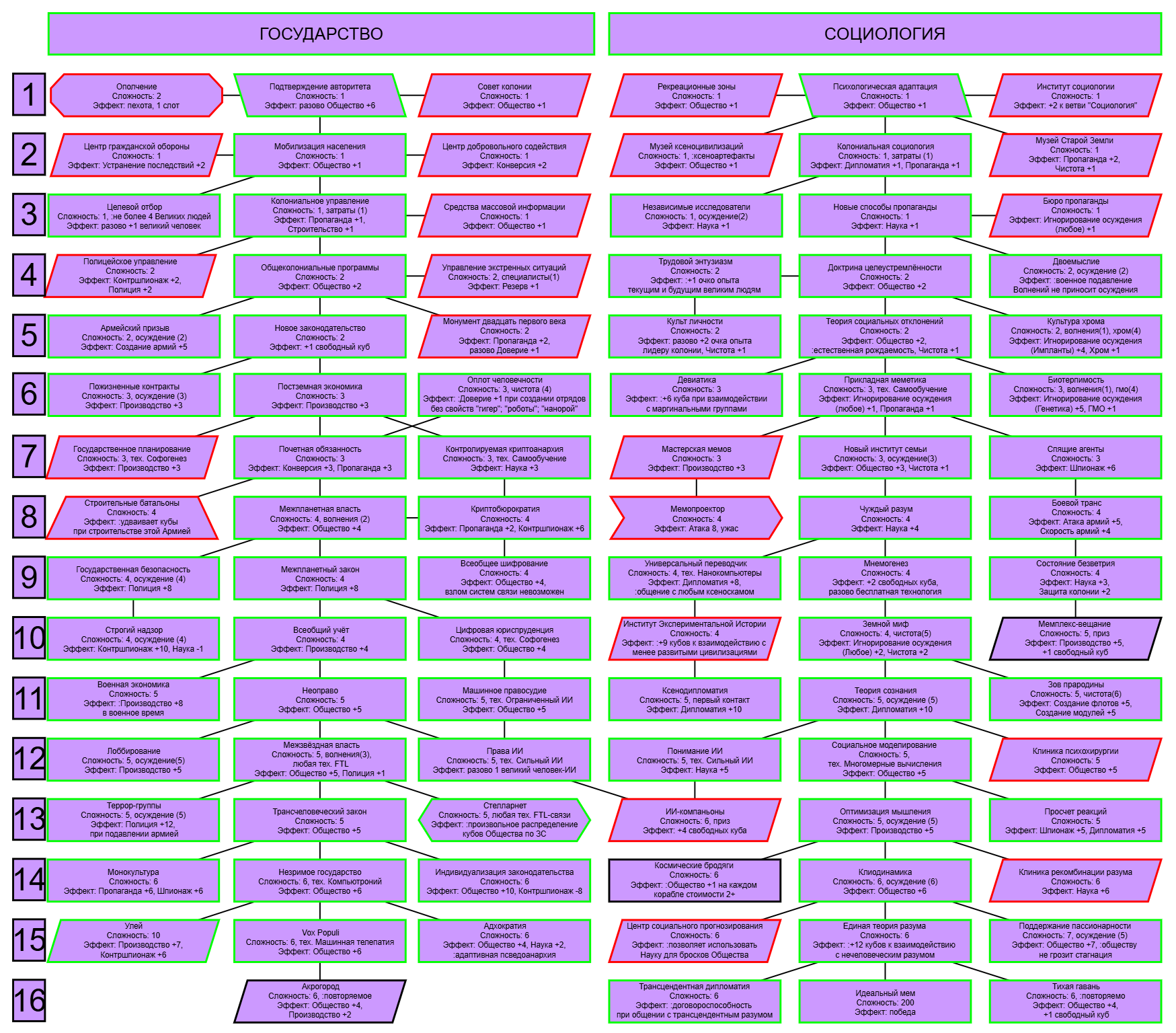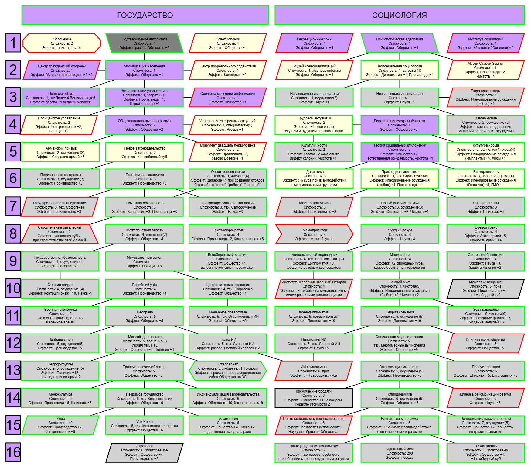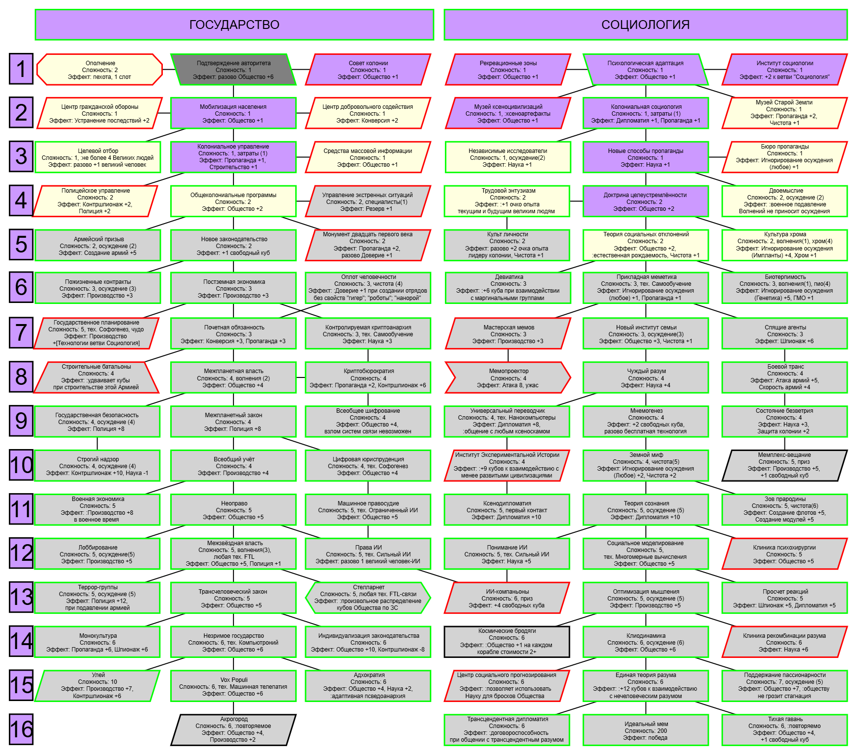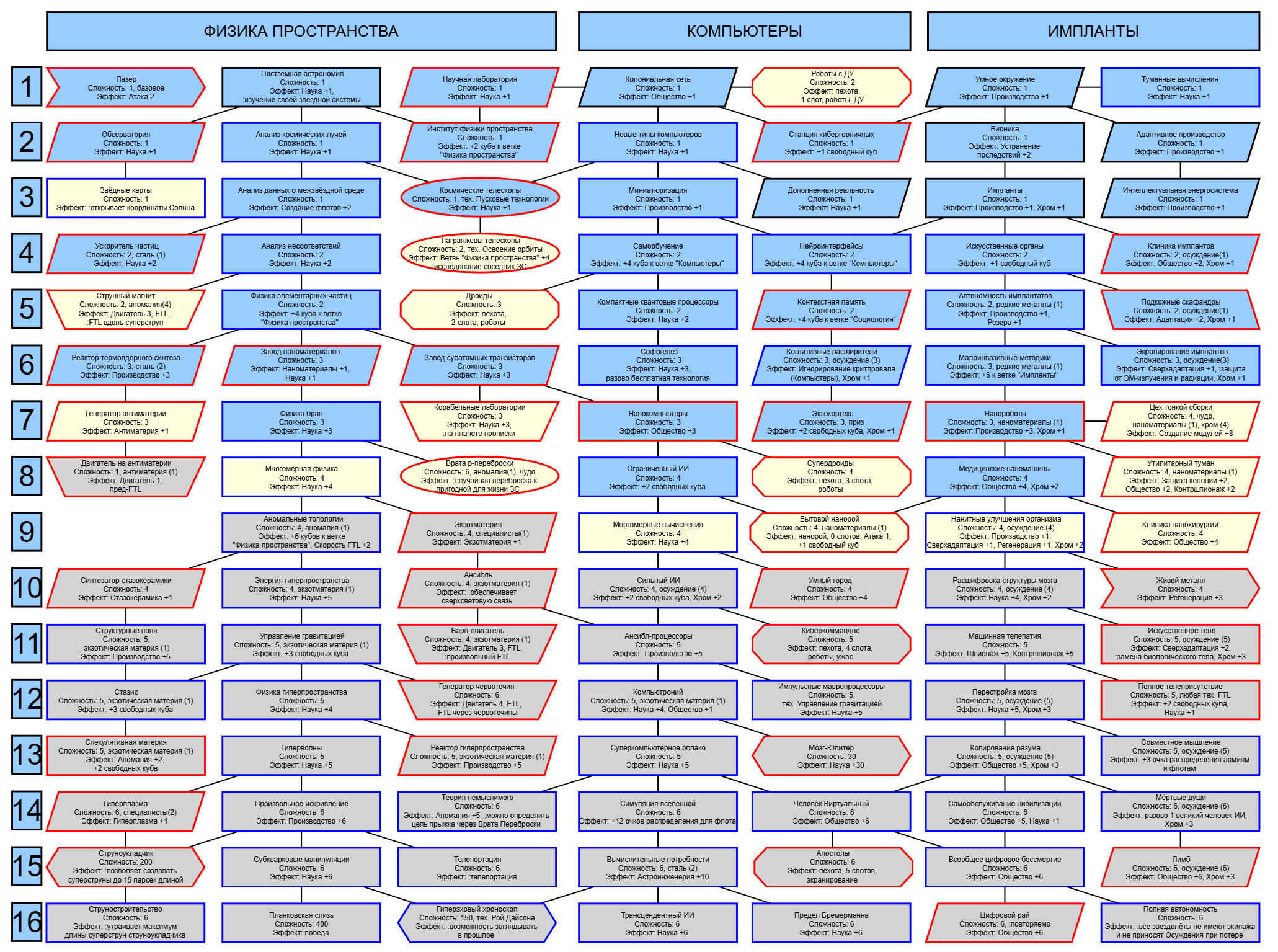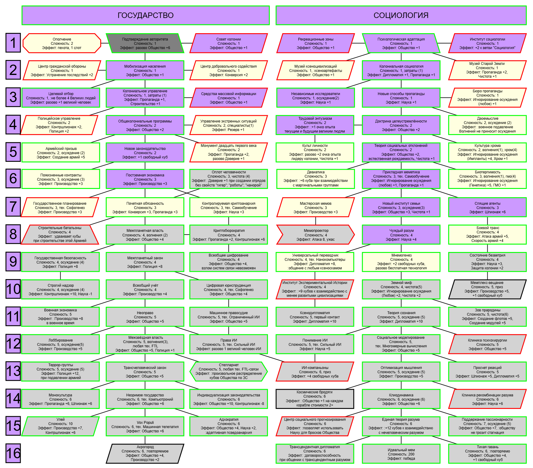 Экзобиология Земная биосфера 4 - Свободный +[Чистота] хром и гмо земную биосферу не красят, а вот чистота да Генетика Вакуумные растения 4 - Общество +[орбитальные здания] Физика пространства Многомерная физика 4 - Наука +[здания Физики пространства/2] чем больше испытаний и лабораторий, тем больше мы понимаем, а кукаретиков всегда навалом Компьютеры Ограниченный ИИ 4 - Свободный +[техи компьютеров/2] Импланты Клиника нанохирургии 4 - Общество +[наноматериалы+трансураны+редкие металлы] ([нм+ту+рм]) богатства недр принадлежат народу в конце концов Добыча Тектоническая кузня 4 - Производство +[Сталь] кузня ух боя, всем кузням кузня, только и успевайте завозить металл Производство Военный завод 3 - Создание армий +[техи Производства] Космос Планетарный плазменный щит 4 - Щит планеты +[орбитальные здания/2] здания на орбите поддерживают щит, очень удобно Наземный бой Стелс-системы 5 - Уклонение армии*2 оно так и было Вооружение и защита Средства космического абордажа 3 - абордаж +[адаптация/2 + сверхадаптация] привет юнитологам Война в космосе Межпланетная полиция 4 - контршпионаж и полиция +[Конверсия/2] типа в межпланетном пространстве при нехватке службистов поощряется друдинство и активная гражданская пощиция в борьбе с нарушителями Государство Государственное планирование 5 - Производство +[техи социологии] Социология Состояние безветрия 4 - Наука +[Защита колонии/2], Защита колонии +2 Ваши ученые не сбегут расщеплять атом к Илонию, если их не бомбят коммунисты