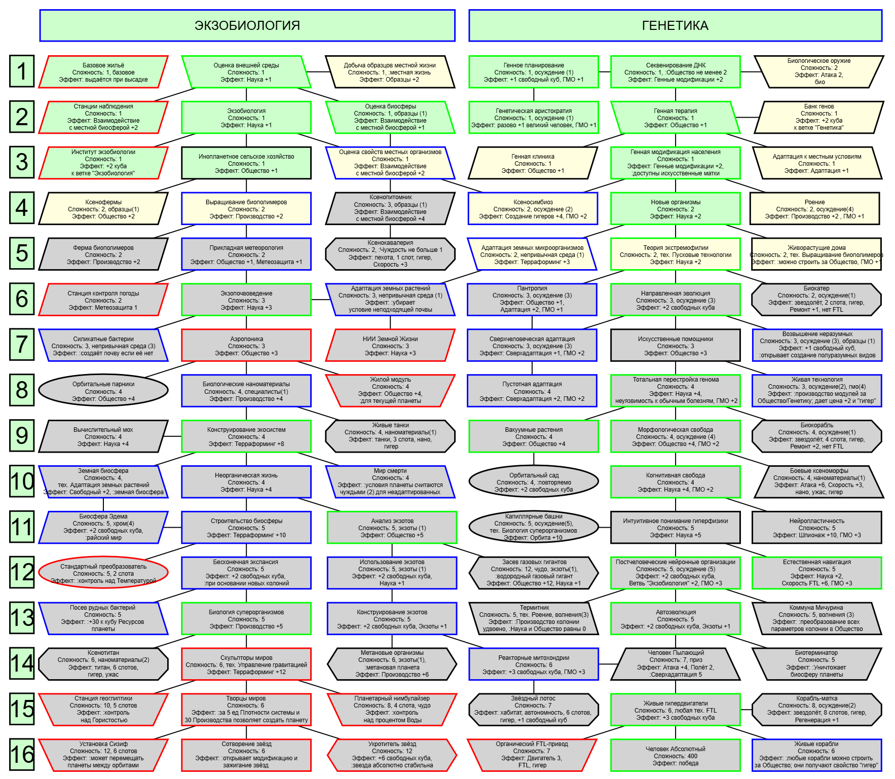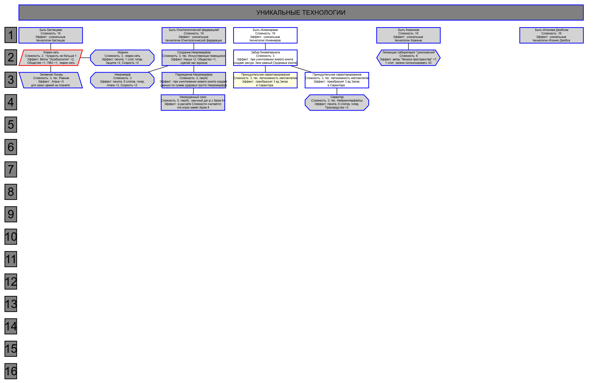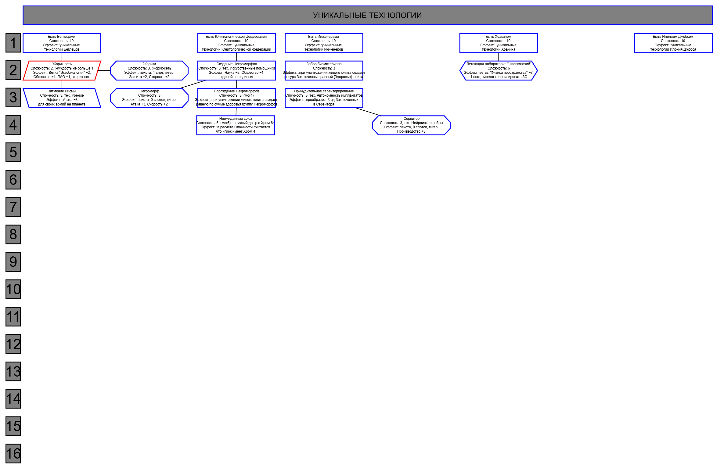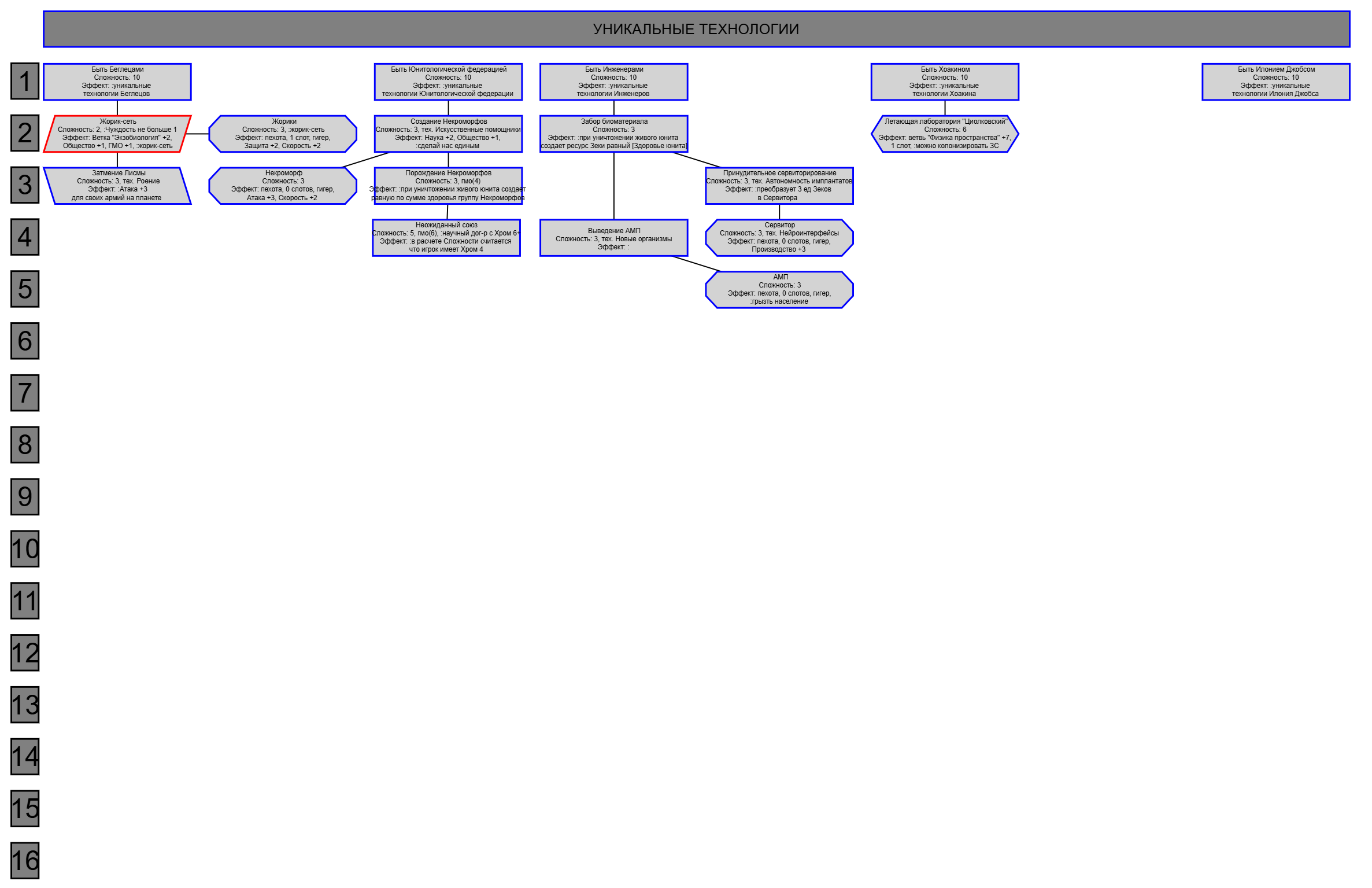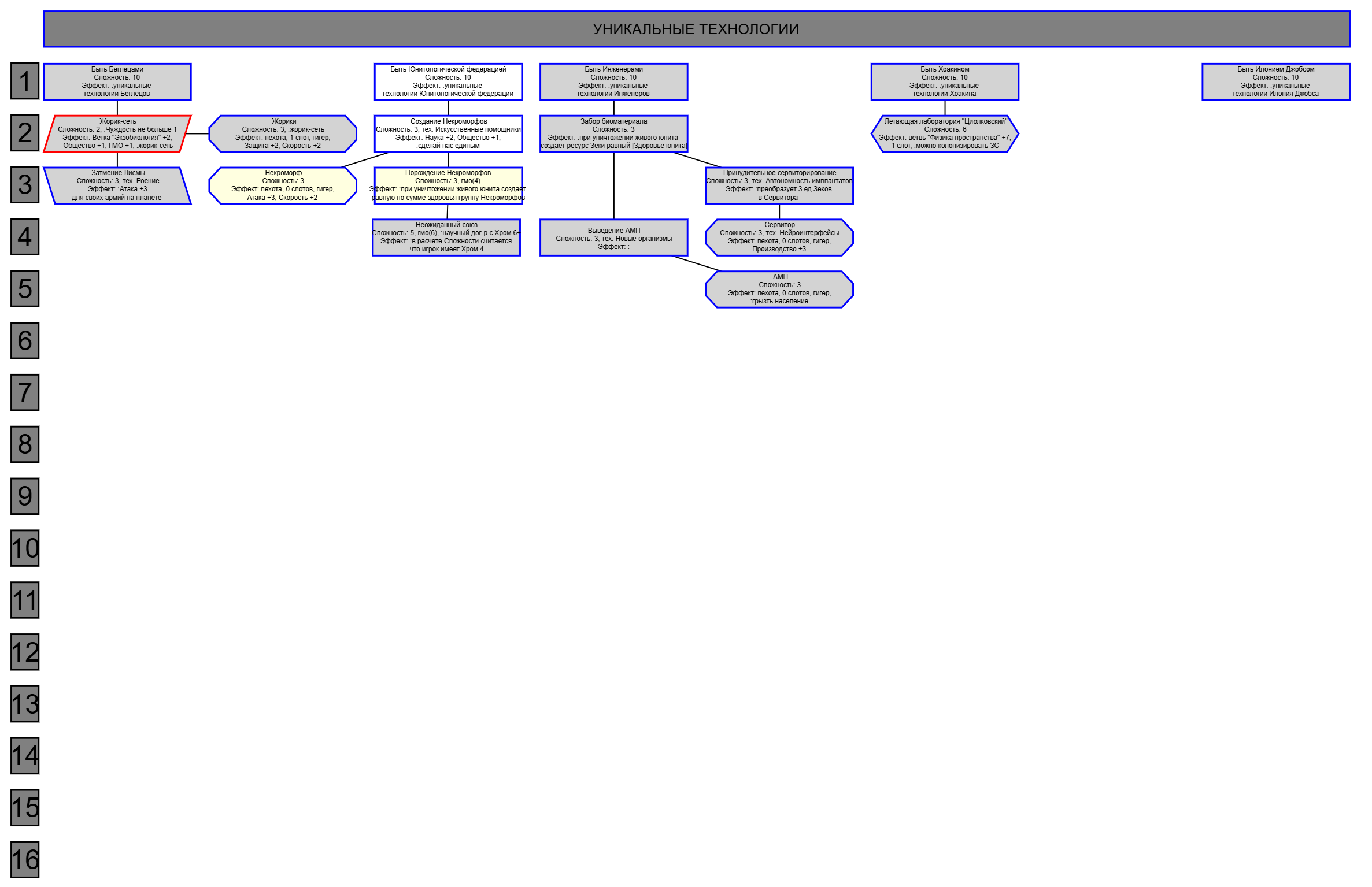 Экзобиология Земная биосфера 4 - Свободный +[Чистота] хром и гмо земную биосферу не красят, а вот чистота да Генетика Вакуумные растения 4 - Общество +[орбитальные здания] Физика пространства Многомерная физика 4 - Наука +[здания Физики пространства/2] чем больше испытаний и лабораторий, тем больше мы понимаем, а кукаретиков всегда навалом Компьютеры Ограниченный ИИ 4 - Свободный +[техи компьютеров/2] Импланты Клиника нанохирургии 4 - Общество +[наноматериалы+трансураны+редкие металлы] ([нм+ту+рм]) богатства недр принадлежат народу в конце концов Добыча Тектоническая кузня 4 - Производство +[Сталь] кузня ух боя, всем кузням кузня, только и успевайте завозить металл Производство Военный завод 3 - Создание армий +[техи Производства] Космос Планетарный плазменный щит 4 - Щит планеты +[орбитальные здания/2] здания на орбите поддерживают щит, очень удобно Наземный бой Стелс-системы 5 - Уклонение армии*2 оно так и было Вооружение и защита Средства космического абордажа 3 - абордаж +[адаптация/2 + сверхадаптация] привет юнитологам Война в космосе Межпланетная полиция 4 - контршпионаж и полиция +[Конверсия/2] типа в межпланетном пространстве при нехватке службистов поощряется друдинство и активная гражданская пощиция в борьбе с нарушителями Государство Государственное планирование 5 - Производство +[техи социологии] Социология Состояние безветрия 4 - Наука +[Защита колонии/2], Защита колонии +2 Ваши ученые не сбегут расщеплять атом к Илонию, если их не бомбят коммунисты