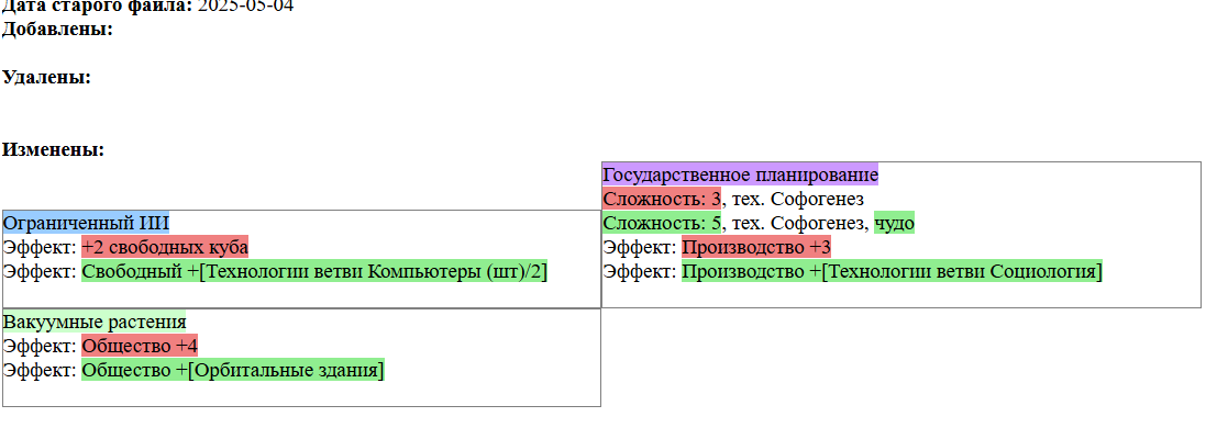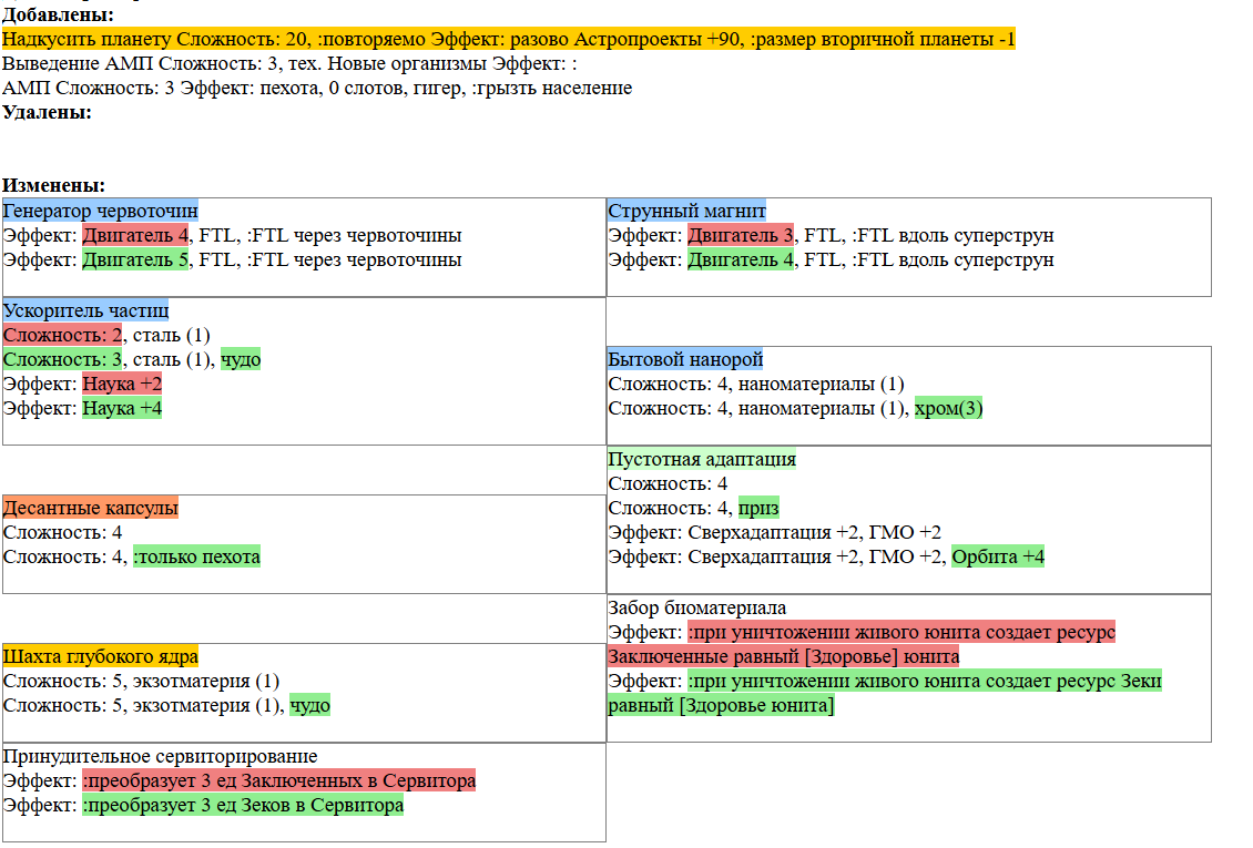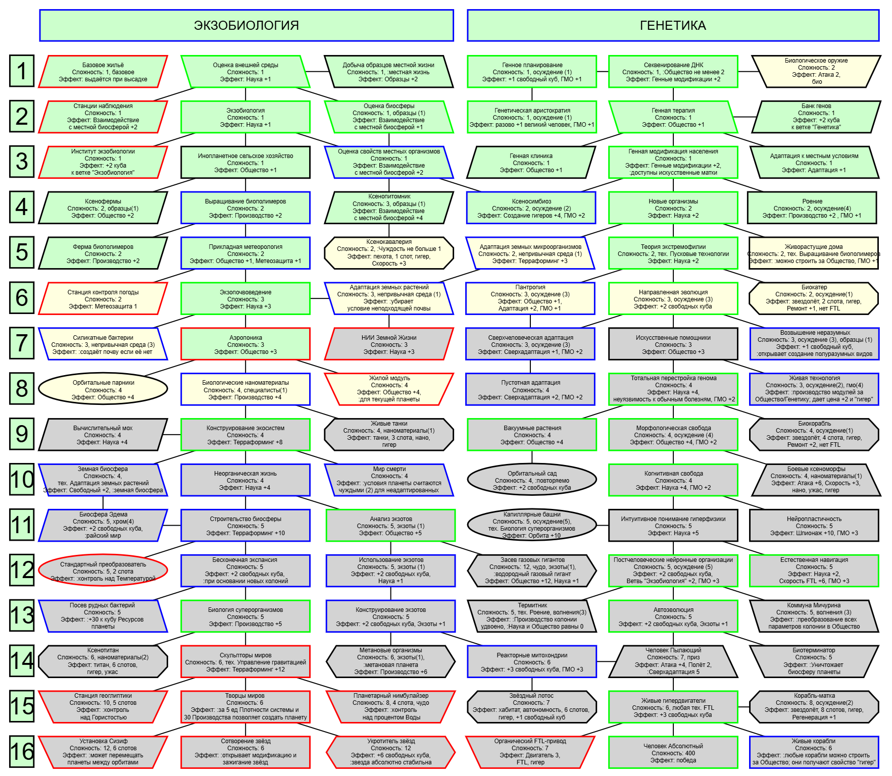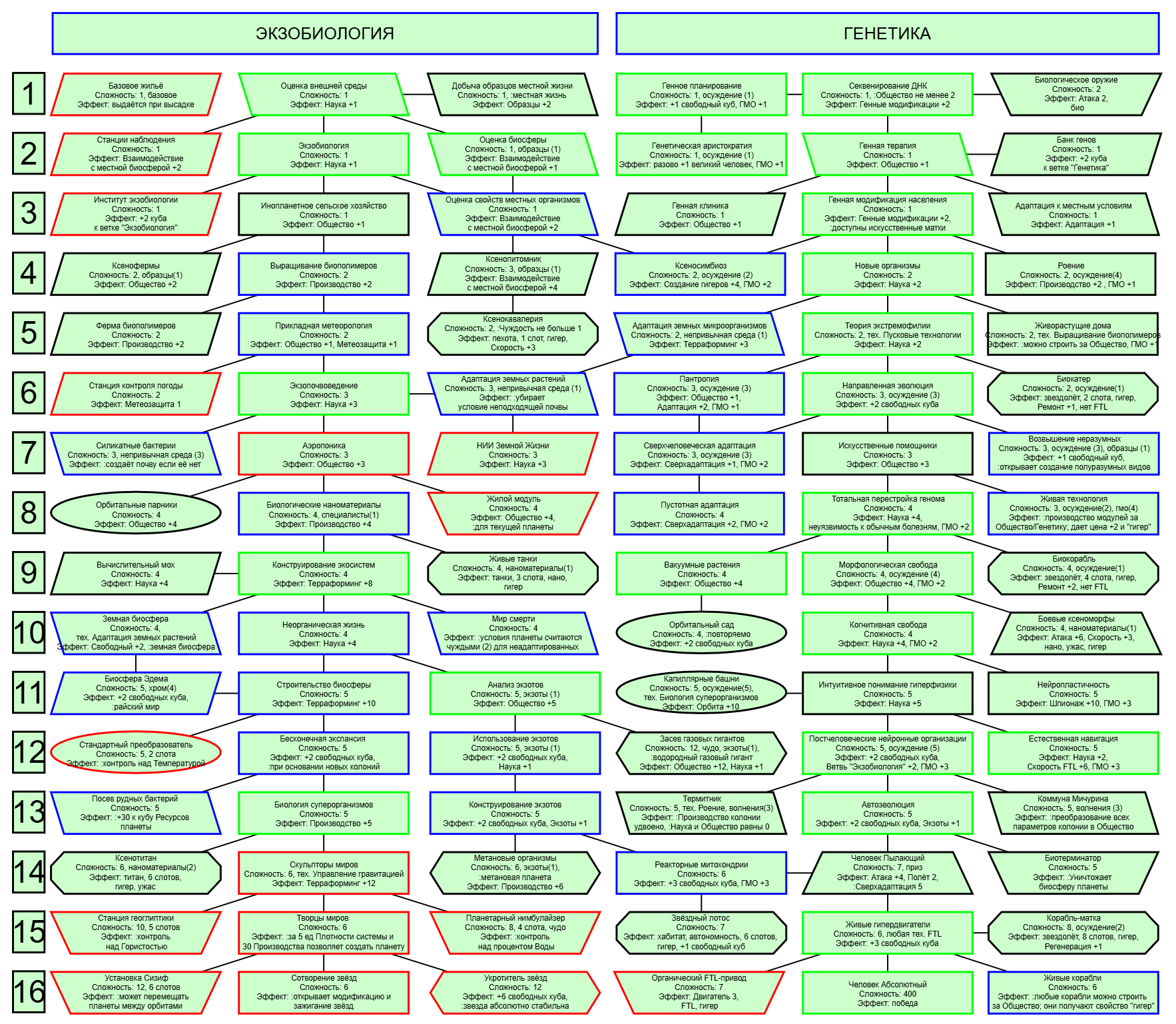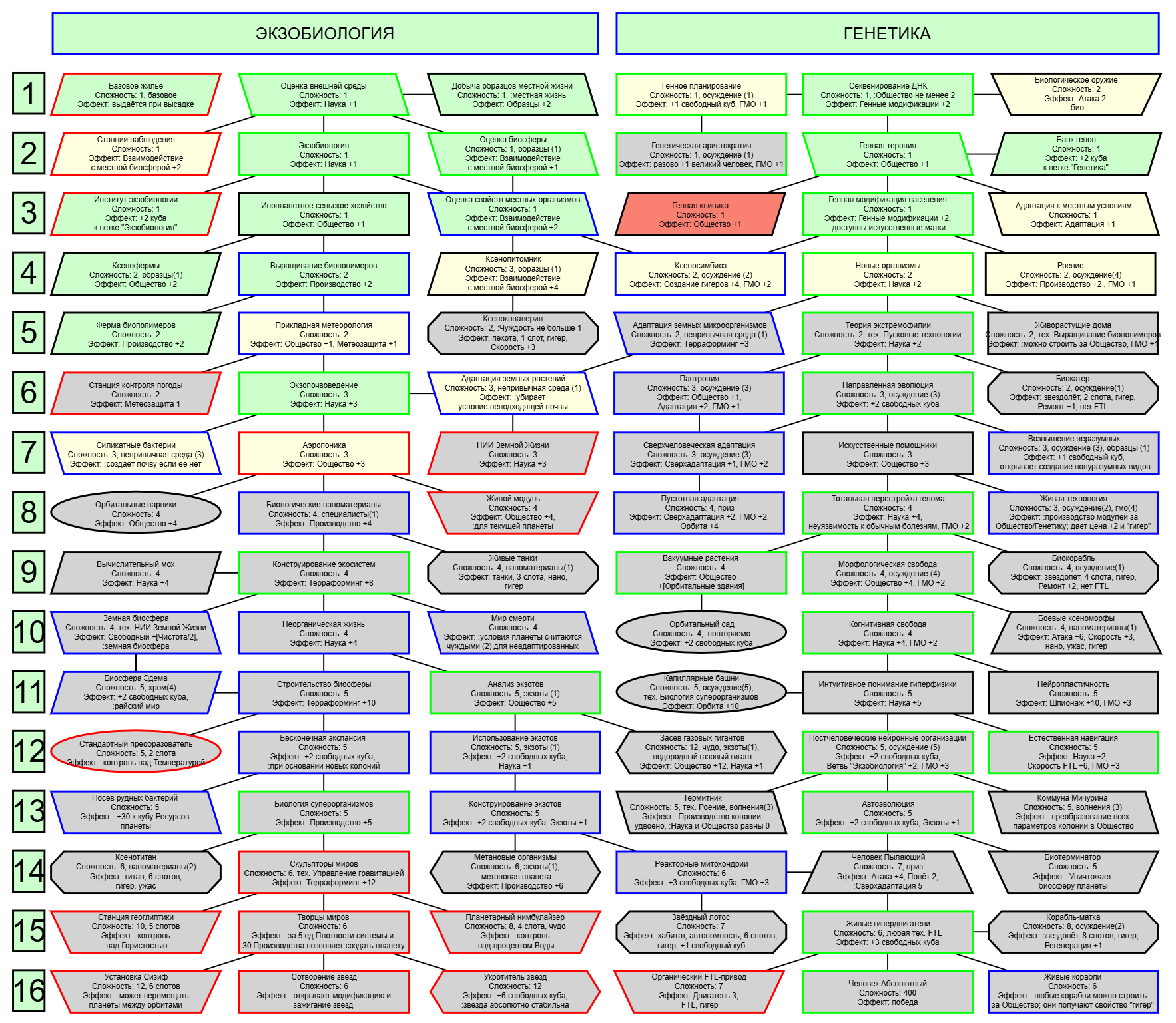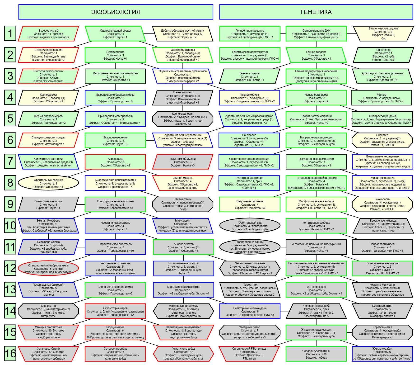 Экзобиология Земная биосфера 4 - Свободный +[Чистота] хром и гмо земную биосферу не красят, а вот чистота да Генетика Вакуумные растения 4 - Общество +[орбитальные здания] Физика пространства Многомерная физика 4 - Наука +[здания Физики пространства/2] чем больше испытаний и лабораторий, тем больше мы понимаем, а кукаретиков всегда навалом Компьютеры Ограниченный ИИ 4 - Свободный +[техи компьютеров/2] Импланты Клиника нанохирургии 4 - Общество +[наноматериалы+трансураны+редкие металлы] ([нм+ту+рм]) богатства недр принадлежат народу в конце концов Добыча Тектоническая кузня 4 - Производство +[Сталь] кузня ух боя, всем кузням кузня, только и успевайте завозить металл Производство Военный завод 3 - Создание армий +[техи Производства] Космос Планетарный плазменный щит 4 - Щит планеты +[орбитальные здания/2] здания на орбите поддерживают щит, очень удобно Наземный бой Стелс-системы 5 - Уклонение армии*2 оно так и было Вооружение и защита Средства космического абордажа 3 - абордаж +[адаптация/2 + сверхадаптация] привет юнитологам Война в космосе Межпланетная полиция 4 - контршпионаж и полиция +[Конверсия/2] типа в межпланетном пространстве при нехватке службистов поощряется друдинство и активная гражданская пощиция в борьбе с нарушителями Государство Государственное планирование 5 - Производство +[техи социологии] Социология Состояние безветрия 4 - Наука +[Защита колонии/2], Защита колонии +2 Ваши ученые не сбегут расщеплять атом к Илонию, если их не бомбят коммунисты