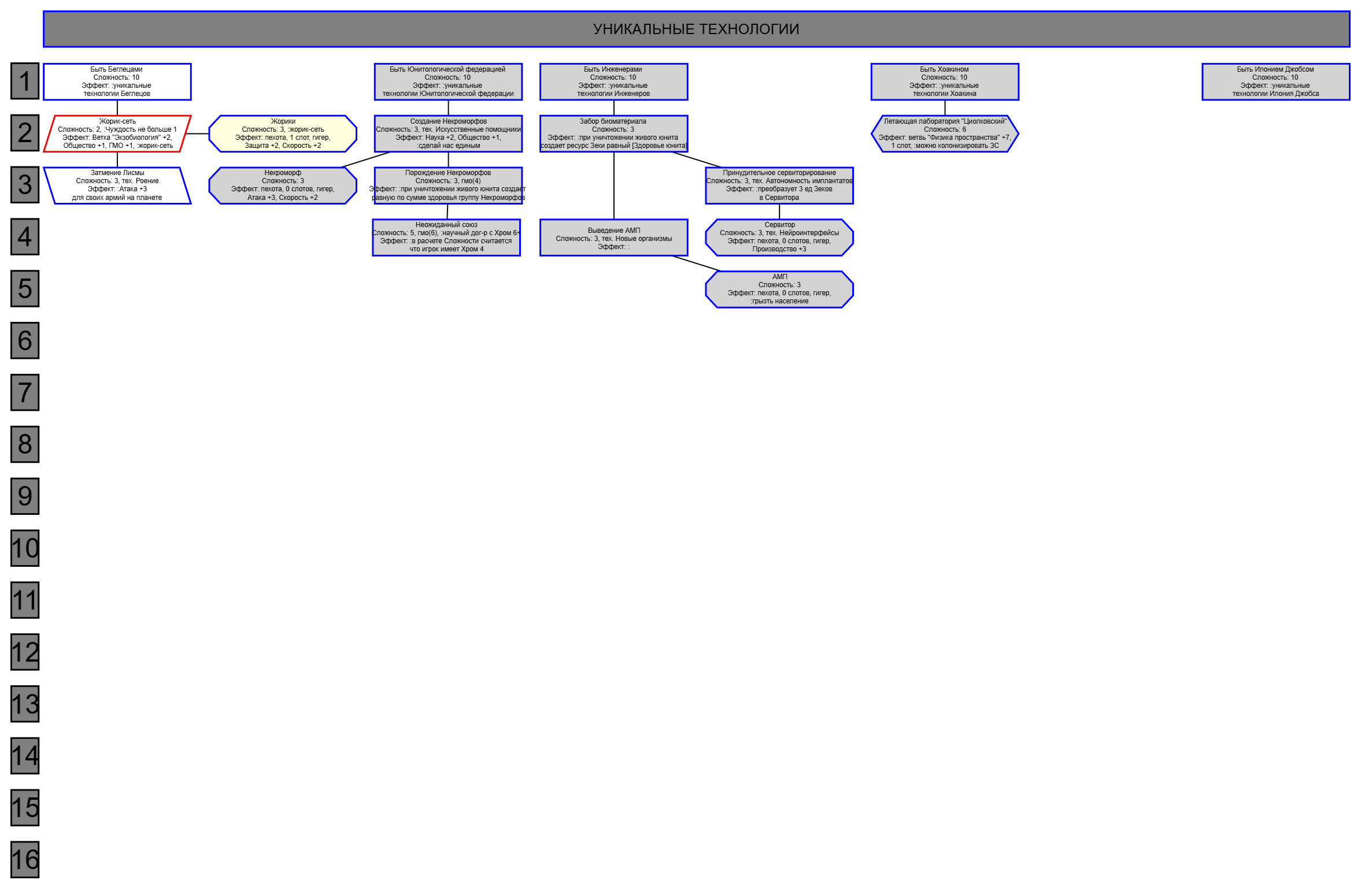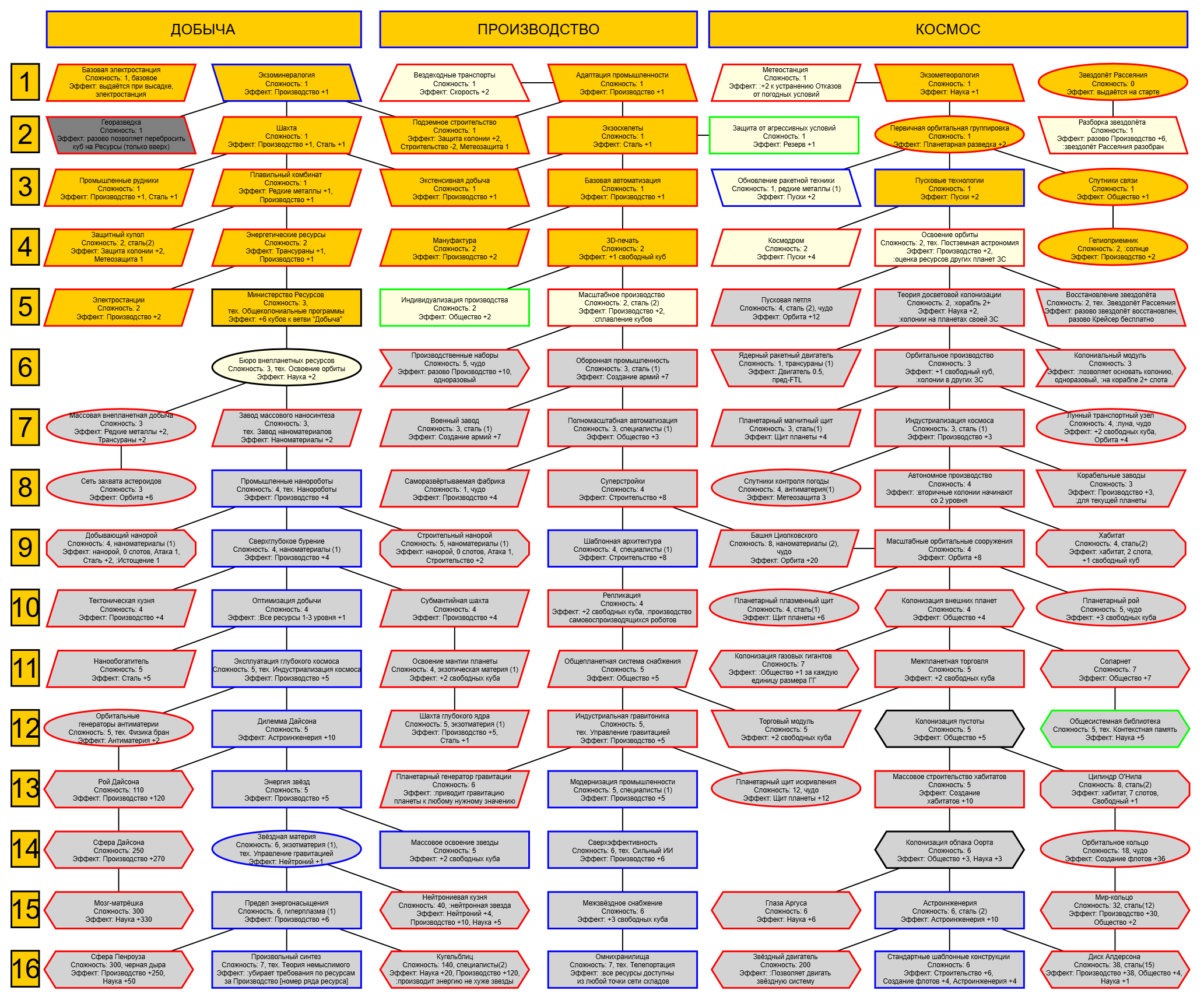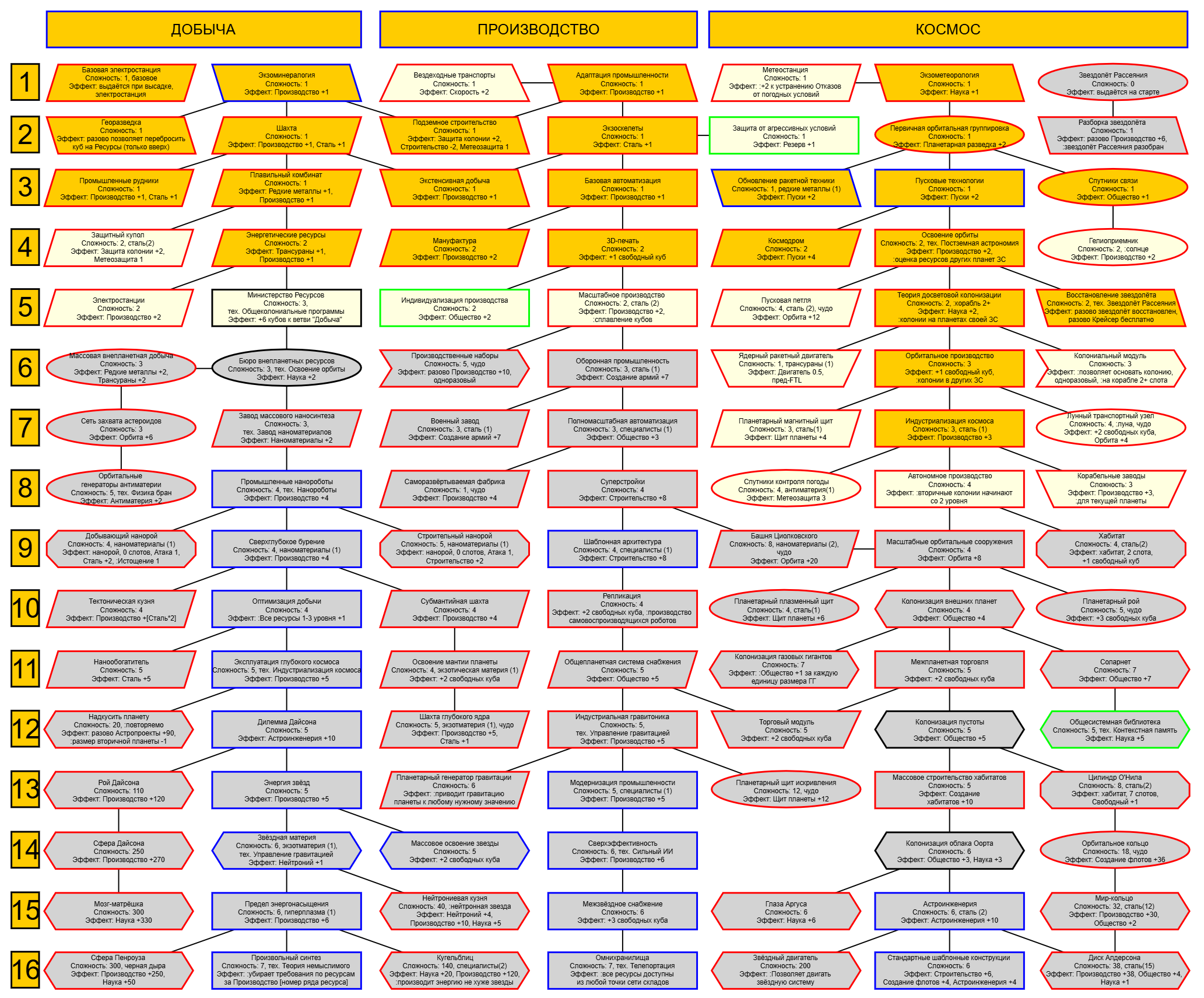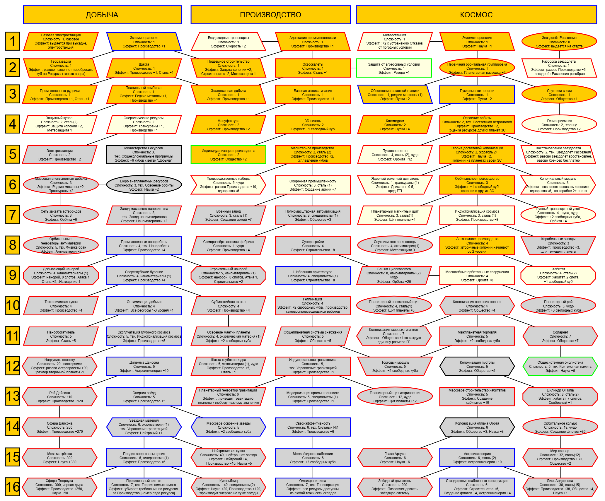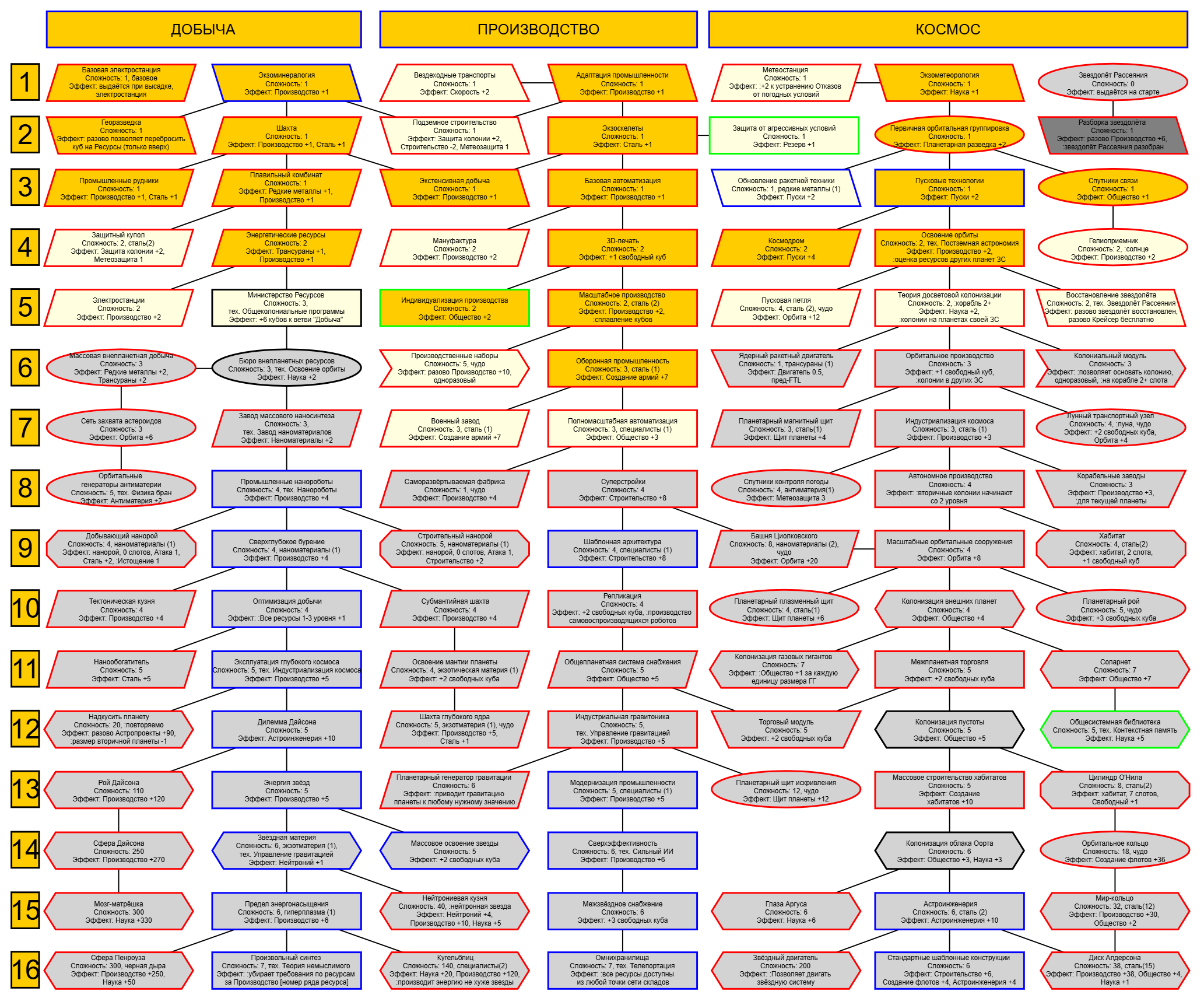 Примерно пока набросал. После названия техи цифра - ее стоимость. Старался выбирать техи не из основной ветки, чтобы игрок принимал решение надо оно ему или нет. Постарался так же не замкнуть зависимости в круг типа 1 > +2 > +3 > +1, но все же проверь. Оптимизация добычи только станет вдвое полезнее, потому что сразу ресы дает, на которые я тут пару штук завязал, но ты сам скорректируешь где чо