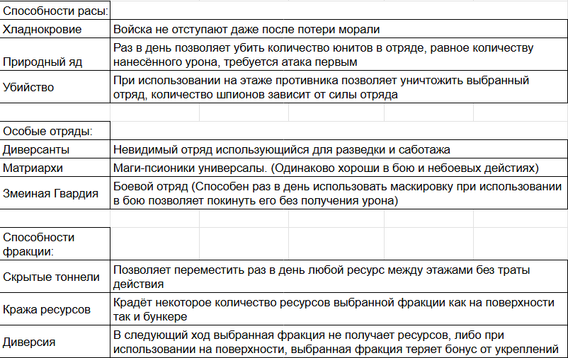Способности фракции (Для использования требуются очки планирования, производятся в специальном здании) Скрытые тоннели - позволяет переместить раз в день любой ресурс между этажами без траты действия Кража ресурсов - крадёт некоторое количество ресурсов одной из фракции как на поверхности так и бункере Диверсия - в следующий ход раса не получает ресурсов, либо при использовании на поверхности блокирует бонус от укреплений