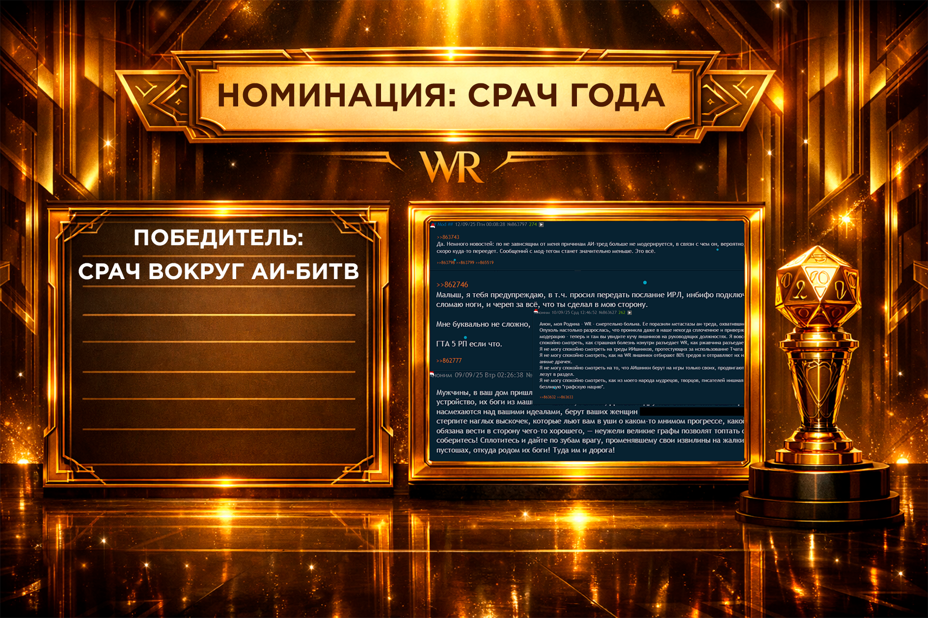 Благодаря анону, который собрал статистику и устроил награждение по итогам года, мы знаем, что доска действительно ожила, даже без учёта ИИ-битв. Надеюсь, кстати, увидеть тебя в этом же качестве и в декабре наступающего года. А пока в знак особой признательности картинка с награждения станет лицом следующего закрепа. Спасибо тебе! Помянем почившее весной «Аббатство» и целую вереницу его вбоквелов - аристократство, пепел богов, бункер… Они не взлетали, да, но неизменно вызывали всеобщий интерес и шквальный постинг, хе-хе. А ещё природа настолько очистилась, что у нас появилась первая со времен Вторжения официальная вареничная! Но постарайтесь все равно слишком не увлекаться.