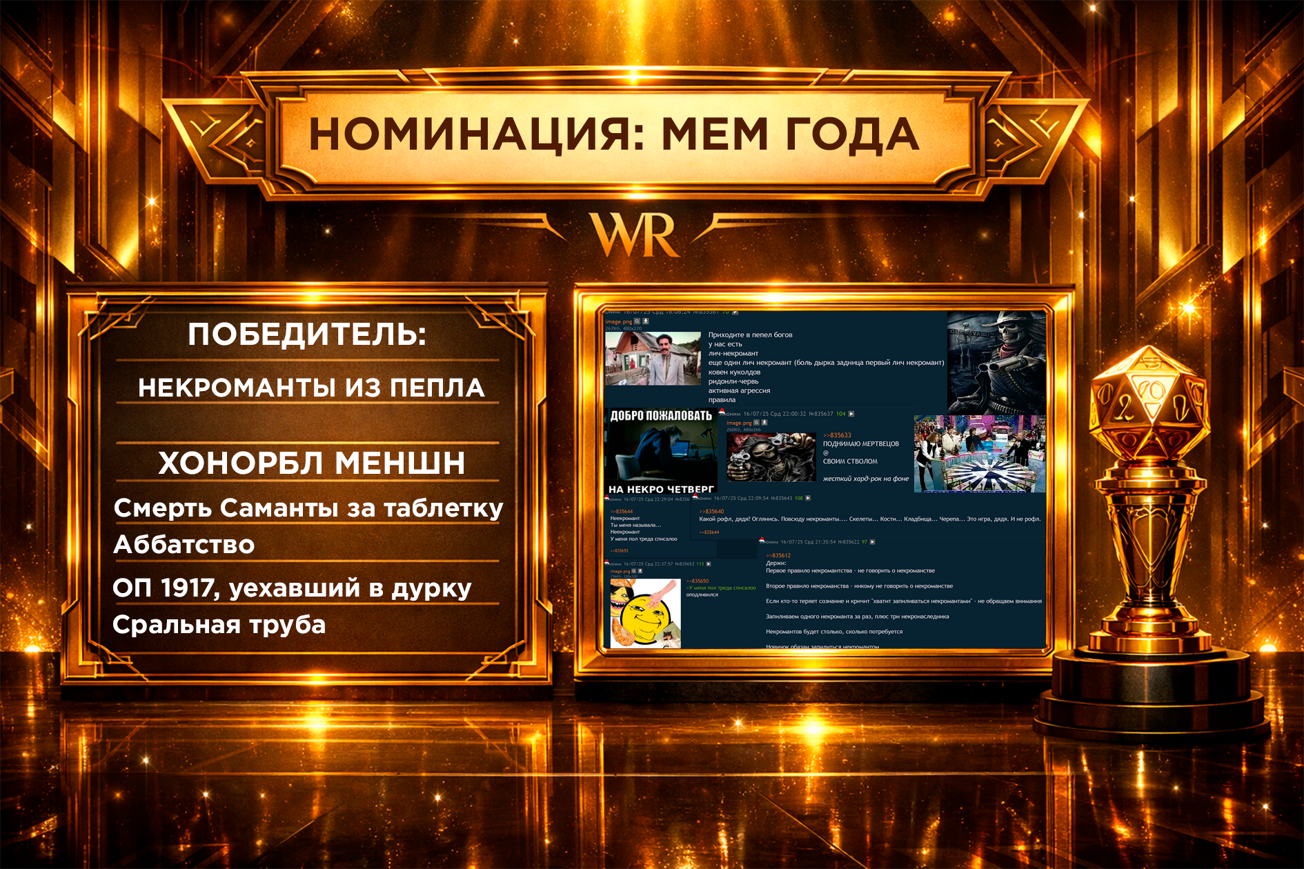 НОМИНАЦИЯ: ПРОВАЛ ГОДА Громкое начинание, которое не оправдалось. Игра, у которой было всё, кроме результата: дропы, срачи и разочарование. ПОБЕДИТЕЛЬ: ЖЕЛЕЗНЫЕ ТИТАНЫ, ПЕПЕЛ БОГОВ Комментарий ведущего: аналогично, голоса распределились поровну между двумя играми. Увы, если аристократство породило несколько мемов и продержалось некоторое время на чатике братьев игроков, то Железные титаны, несмотря на перезапуск, так и не подавали признаков жизни с самого старта игры.