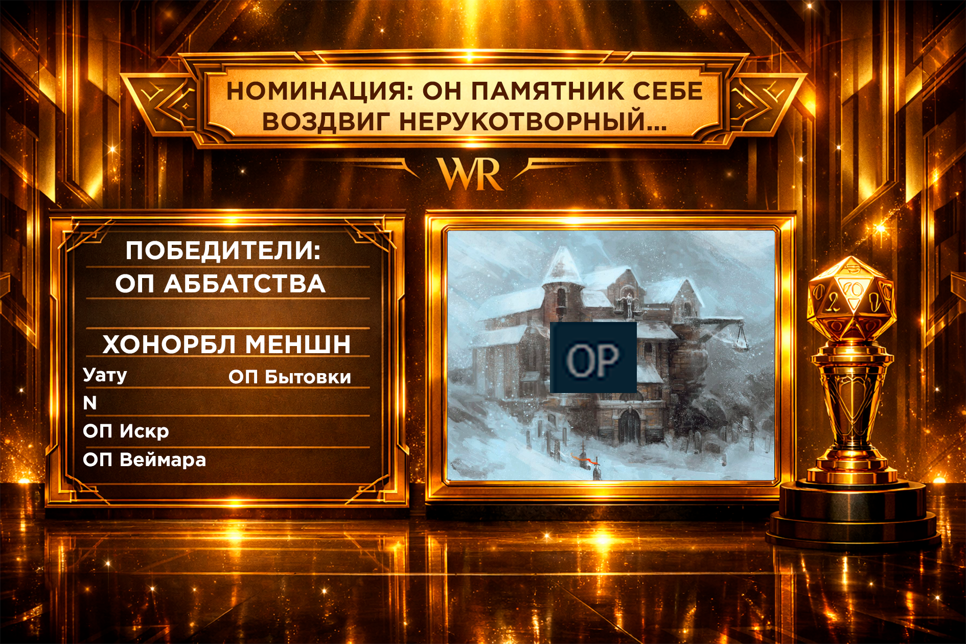 НОМИНАЦИЯ: ИГРА ГОДА Игра, которая стала главным событием года: обсуждалась, порождала треды и запоминалась. Та самая, про которую говорили: "вот ради этого я и сижу на /wr". ПОБЕДИТЕЛЬ: АББАТСТВО, МИСФОРЧЕН, БУНКЕР Комментарий ведущего: голоса распределились поровну между тремя претендентами. Можно было бы зачесть бункер и аббатство как единый тайтл, но судьбы у игр разные. Чтобы не устраивать судейские подтасовки и не проводить еще один раунд голосования, было принято решение дать статус "игры года" всем трем играм.