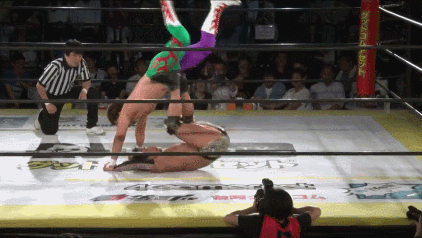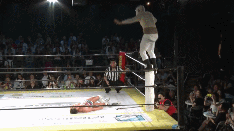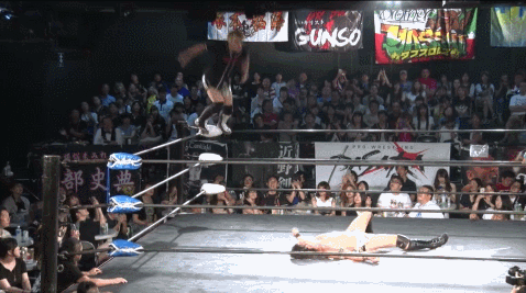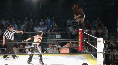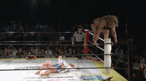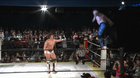 Этот мув такой тупой. Это типо такой контр коронного дропкика Окады? Тогда зачем он так раздвинул свои ноги в момент прыжка? Что-то я сильно сомневаюсь по поводу того, что он хотел сделать хуриканрану, которую никогда в своих матчах не использовал.
