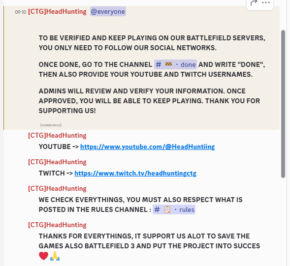 Решил зайти в бф3 и сервер начал сразу требовать зайти в их дискорд сервер иначе забанит навсегда через 5 минут. Оказалось чтобы там играть нужно привязать твич и ютуб в обязательном порядке, пиздец. А еще есть специальные боты которые отслеживают даты создания аккаунта и выгоняют с сервера если твой аккаунт не соответствует их критериям и сама площадка ничего с этими ботами не делает, буквально поддерживая геноцид новых пользователей которых беспричинно банят на половине серваков так как эта хуйня там почти повсеместно, по крайней мере в англоязычном дискорде. Ты новый пользователь, создаешь аккаунт, заходишь на сервер и он моментально пропадает из списка.