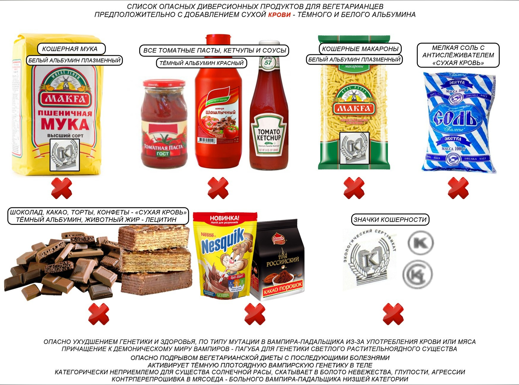 САХАР - белая смерть СОЛЬ - белая смерть СПЕЦИИ - для скуфов, которым нужен рак желудка, чтобы скормить им безвкусную калошу ХЛЕБ, МУЧНОЕ - термофильные дрожжи, грибы, А ВАС НЕ УЧИЛИ УВАЖАТЬ ХЛЕП ? ВСЯ МОЛОЧКА - стрептококки и грибы, сделанные из пальмы ПАЛЬМОВОЕ МАСПО - НЕФТЬ, где вы столько пальм видели вообще СЫР - плесневелый клей АЛКОГОЛЬ И КУРЕВО - разрешённая (и продвигаемая) тяжёлая наркота для быдла МЯСО, РЫБА, КОЛБАСЫ - трупы с червями СЛАДОСТИ (((К ЧАЮ))) - САХАР ПОДСОЛНЕЧНОЕ МАСЛО РАФИНИРОВАННОЕ ДЕЗОДОРИРОВАННОЕ ВЫМОРОЖЕННОЕ - БЕНЗИН ГЕКСАН ТОМАТНАЯ ПАСТА - коровья кровь альбумин МУКА - свинячая плазма крови вперемешку с глютеном ЧЁРНЫЙ ЧАЙ, СОЕВЫЙ СОУС - перебродившие плесневелые грибы КРУПЫ - сомнительная безвкусная хуета СЕМЕЧКИ И ОРЕХИ - сделаны для того, чтобы быстрее разъебать эмаль зубов, чтобы туда как можно легче заполз ржавый кариес. речь даже не про скорлупу, а вообще про жевание твёрдых зёрен. даже у мельницы каменные жернова стираются ОВОЩИ ФРУКТЫ ЗЕЛЕНЬ - выращивайте сами, не из семян монсанты, ЕСЛИ КЛИМАТ ТОТ