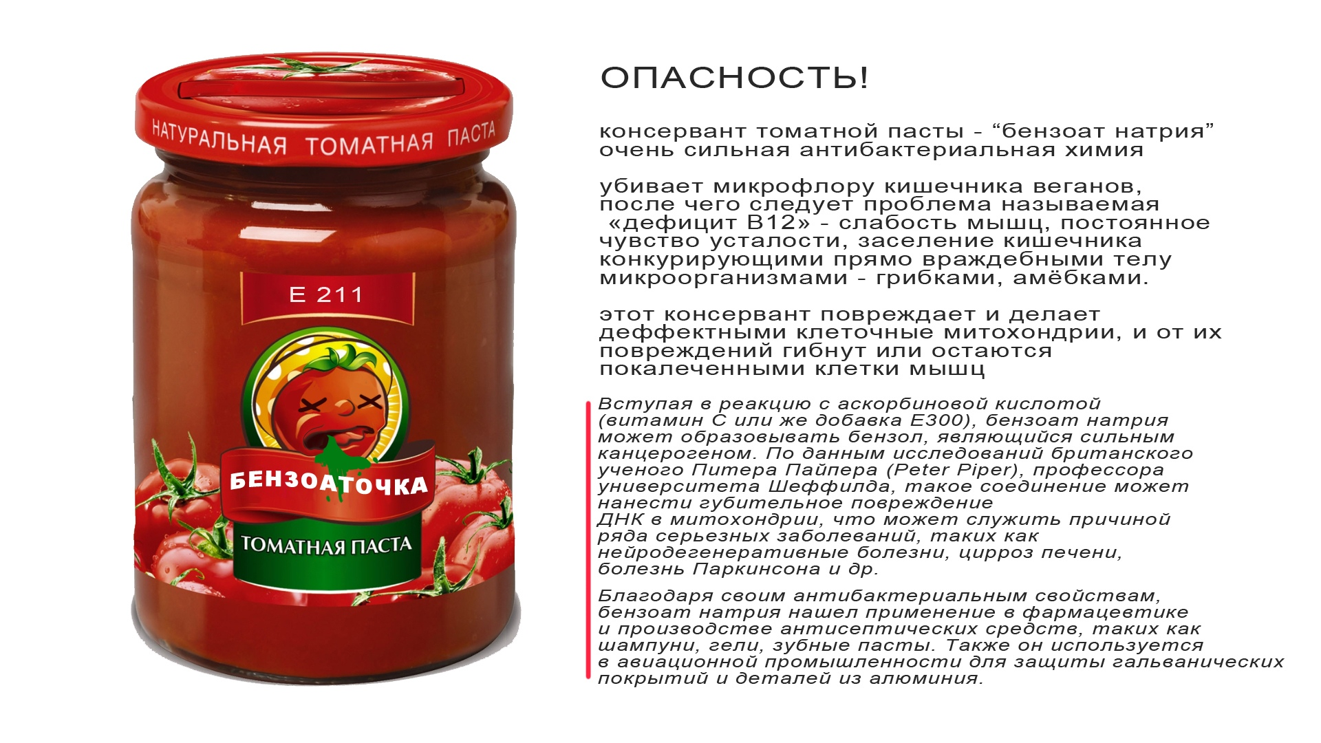 Бензонат натрия, который любят с поводом и без совать во все, что угодно, в взаимодействии с аскорбиновой кислотой, которую тоже суют везде, надо-не надо, образовывает бензол, который вызывает опухоли.