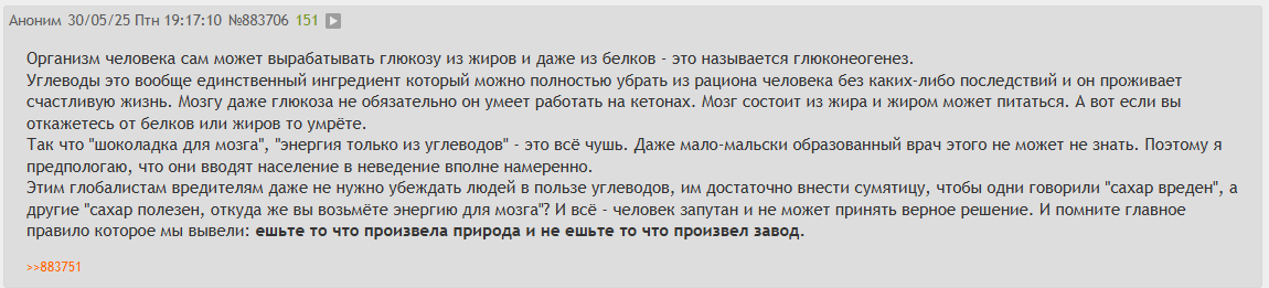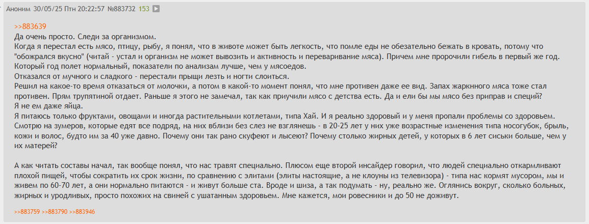 Я повторюсь, я пытаюсь разобраться что мне блять есть чтоб не так сильно хуевило с возрастом, что можно есть что есть поменьше, что вообще нахуй убрать из рациона. Как нас наебывают и умалчивают информацию о том что мы вообще едим. Вот это вопросы стоящие внимания, а эту срань, про то как аухенно вы живете и какие все вокруг дауны, говорят ВСЕ БЛЯТЬ: кето-диетщики, натурально-диетщики, похуйчеесть-диетщики, мясоеды, веганы, все кому не лень выебываются. Идиоты блять.
